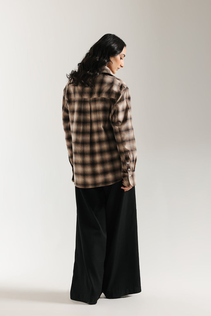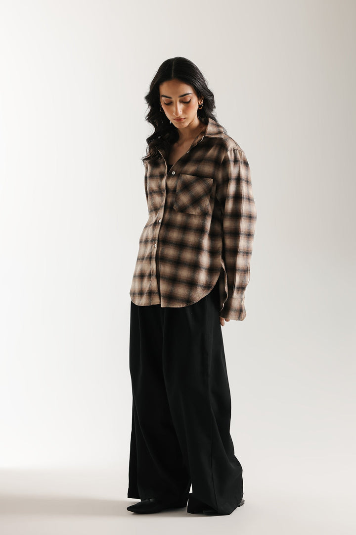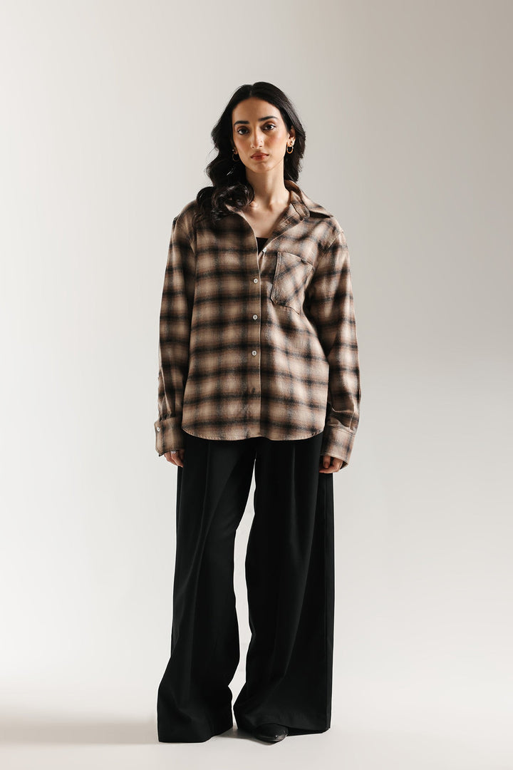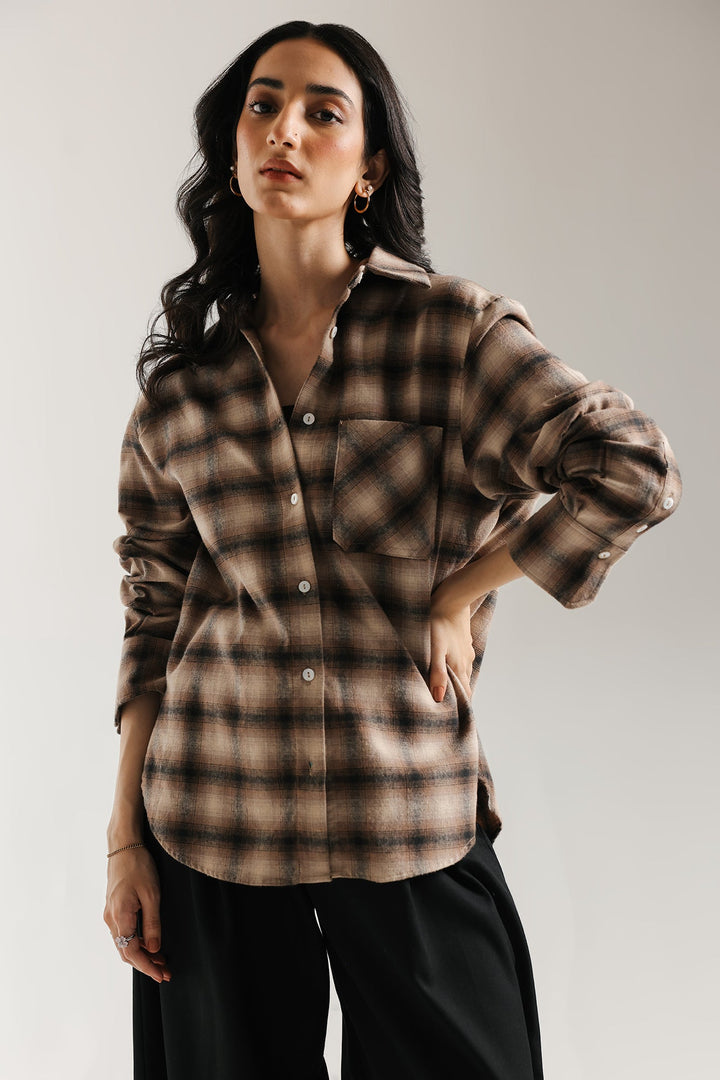 Introduce a cozy and chic element to your casual wardrobe with this stylish plaid shirt. This relaxed-fit button-down features a warm, neutral plaid pattern in shades of beige, brown, and black. Designed for effortless layering, it includes a classic collar, front button closure, and a single chest pocket. The oversized, comfortable silhouette makes it the perfect versatile piece for a modern, relaxed look.
