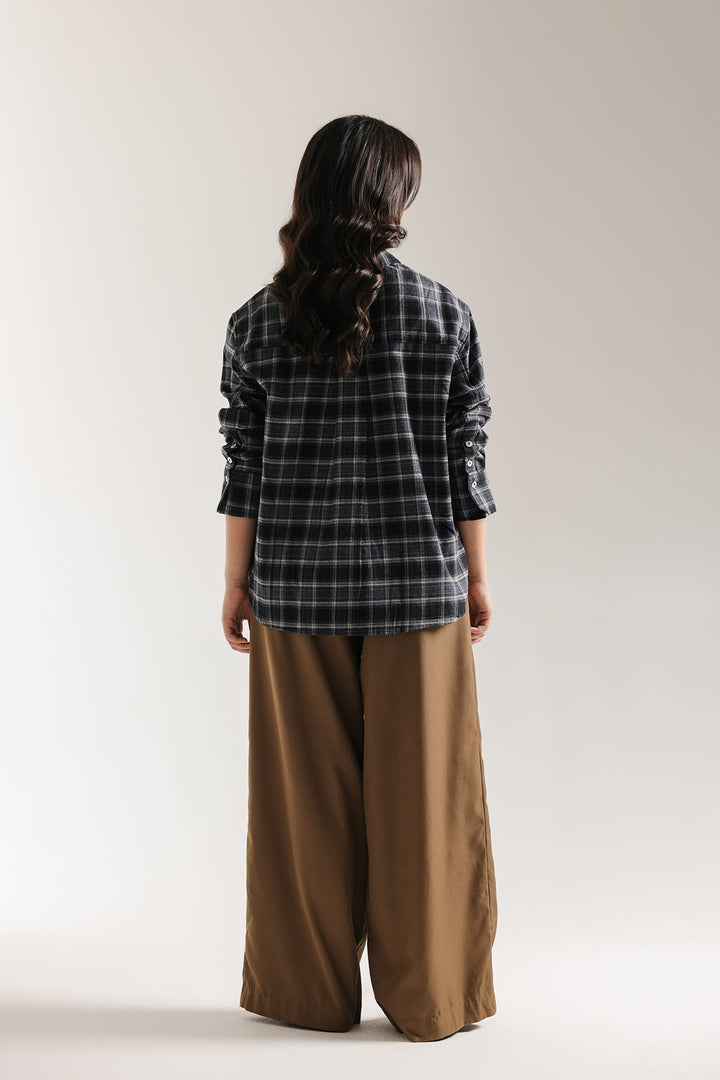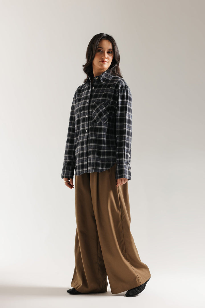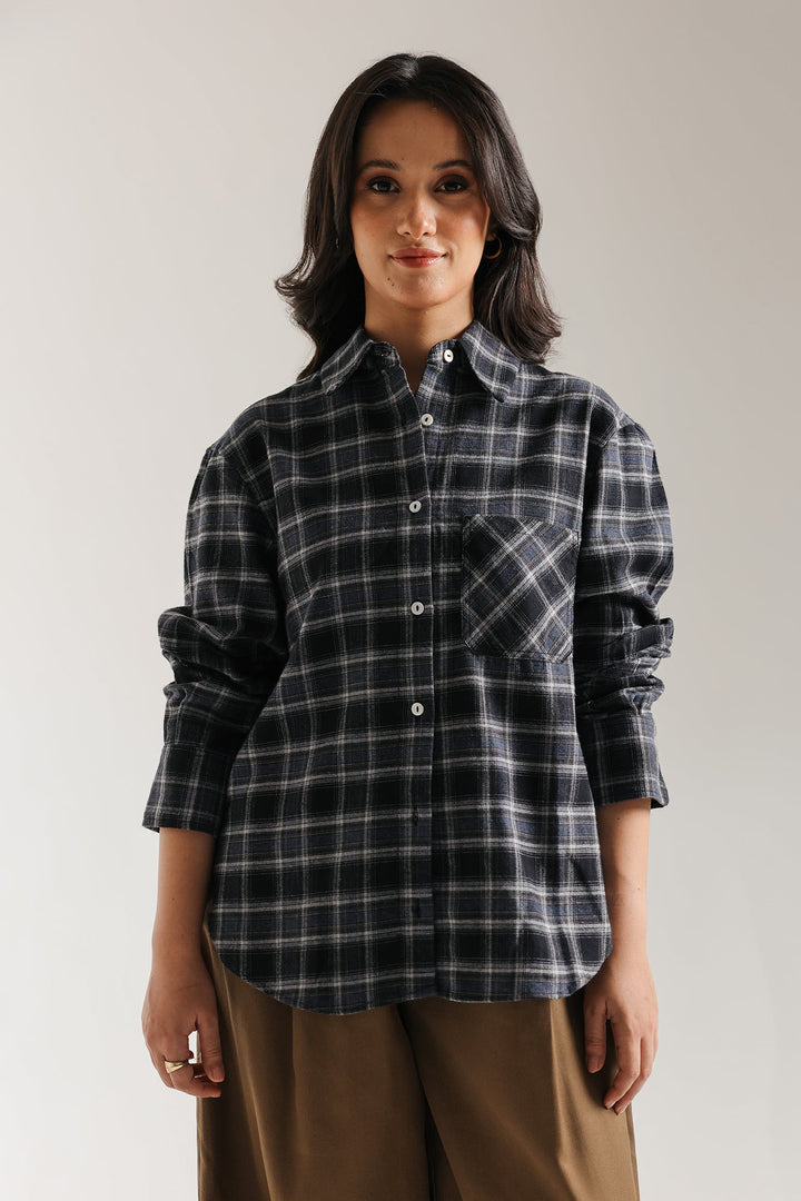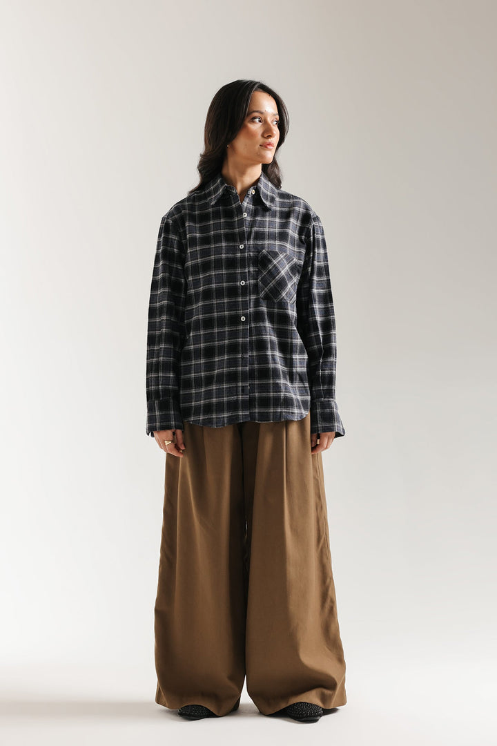 Introduce a cozy and chic element to your casual wardrobe with this stylish plaid shirt. This relaxed-fit button-down features a warm, neutral plaid pattern in shades of black. Designed for effortless layering, it includes a classic collar, front button closure, and a single chest pocket. The oversized, comfortable silhouette makes it the perfect versatile piece for a modern, relaxed look.