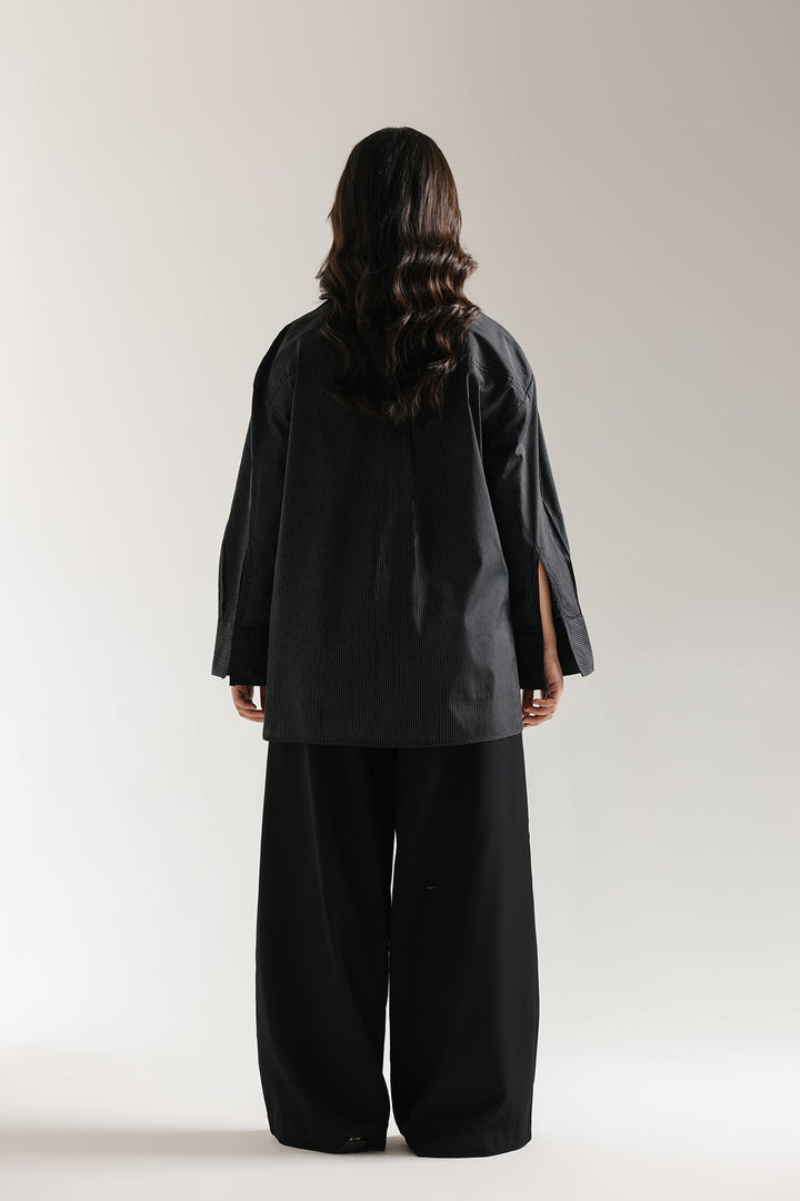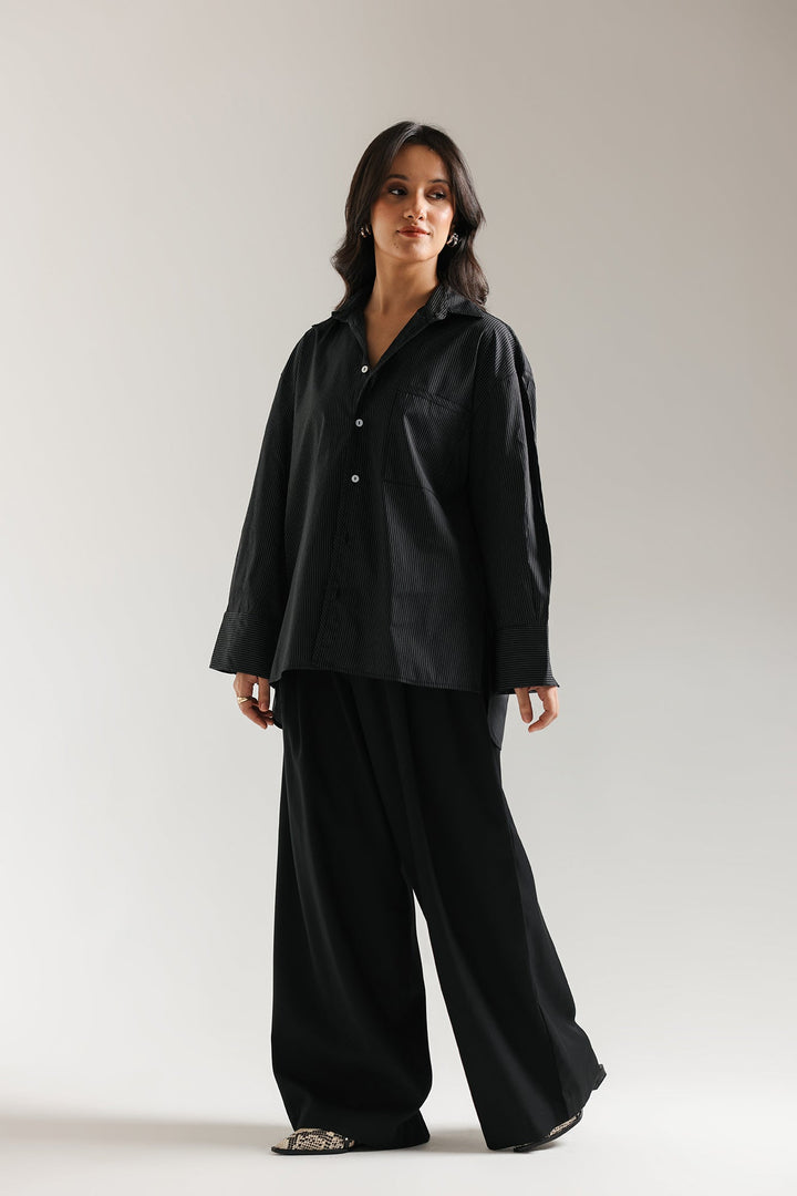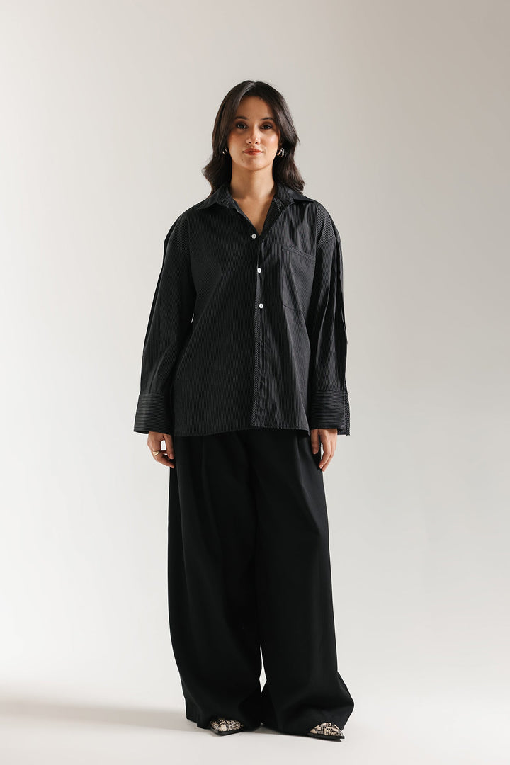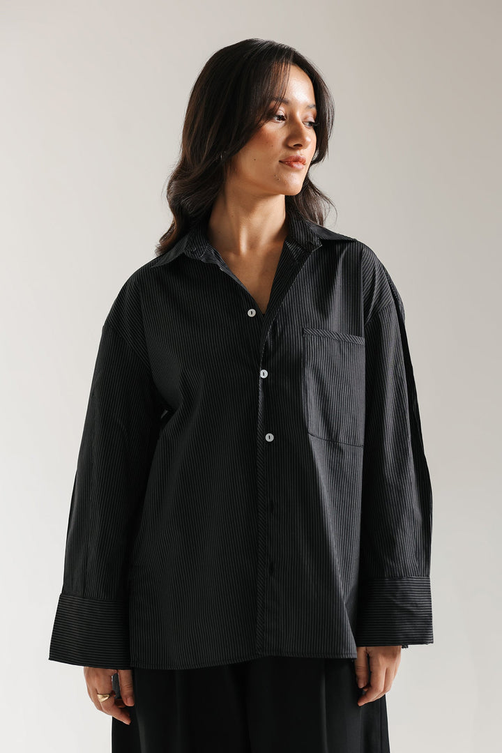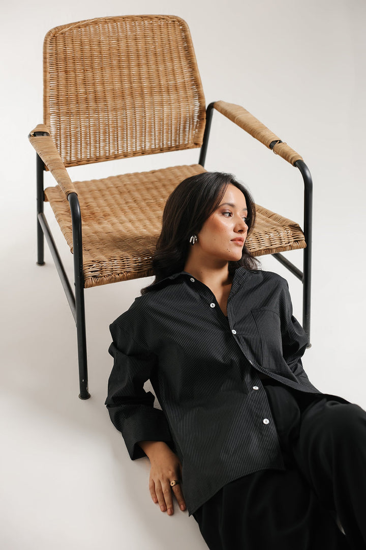 Command effortless power in this minimalist black pinstripe shirt. This versatile top is crafted from a comfortable black fabric and features a subtle white pinstripe pattern. The design maintains a classic button-down structure with a sharp collar and contrasting white buttons, while the relaxed fit introduces a modern, classy silhouette. It also features a single chest pocket. Pair it with wide-leg trousers for a chic, contemporary monochrome look that transitions seamlessly from day to night.