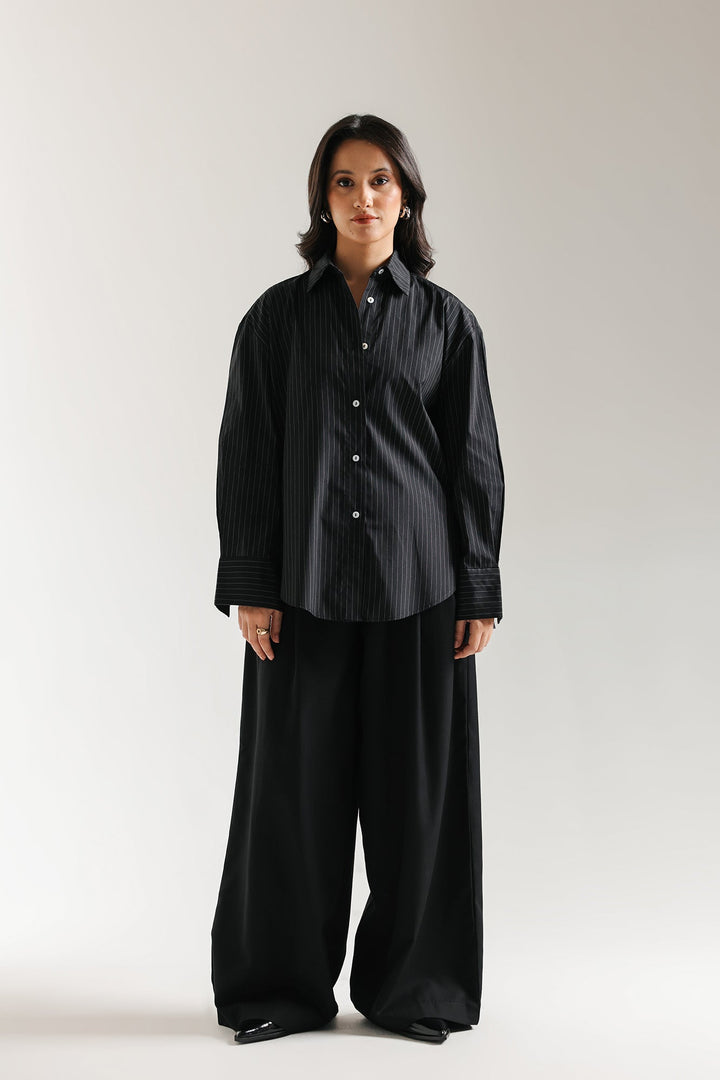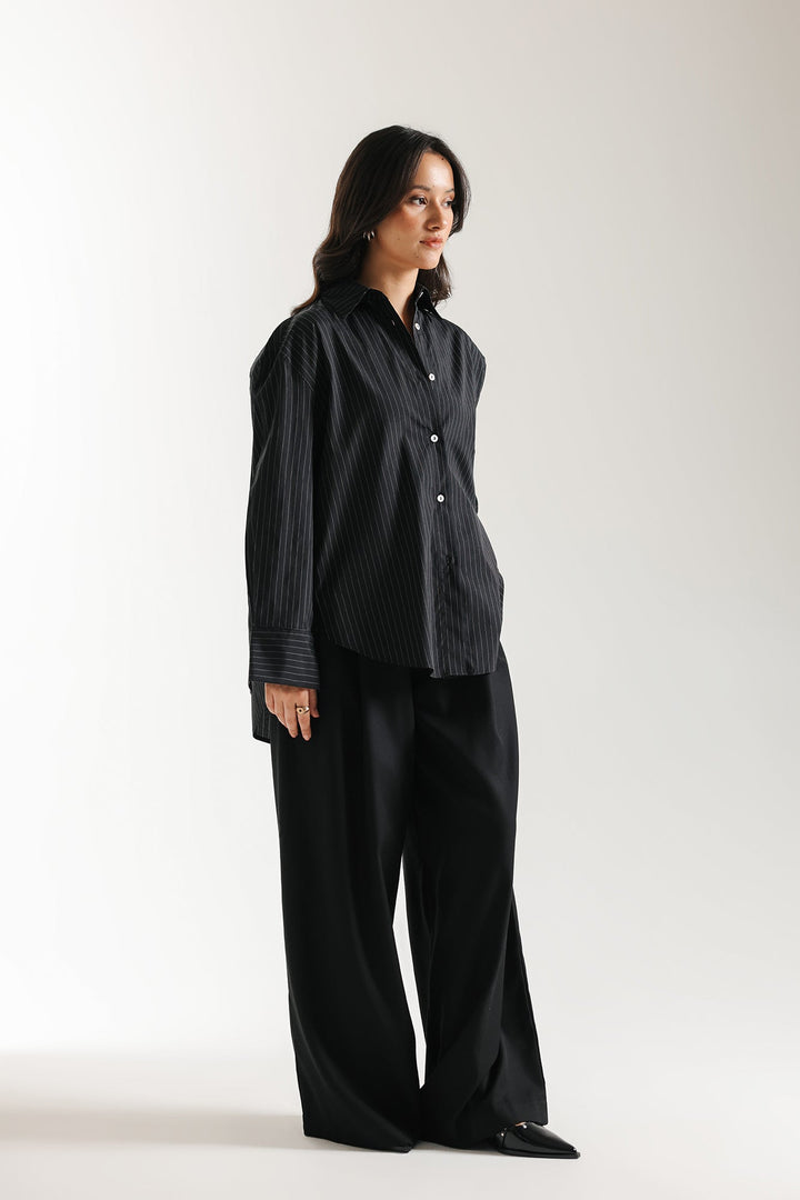 Command effortless power in this minimalist black pinstripe shirt. This versatile top is crafted from a comfortable black fabric and features a subtle white pinstripe pattern. The design maintains a classic button-down structure with a sharp collar and contrasting white buttons, while the relaxed fit introduces a modern, classy silhouette. Pair it with wide-leg trousers for a chic, contemporary monochrome look that transitions seamlessly from day to night.