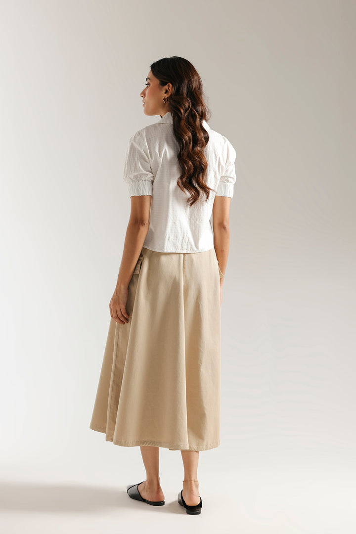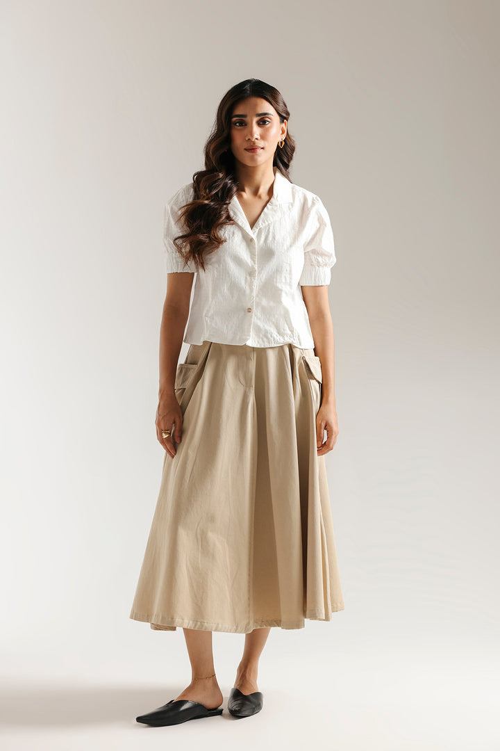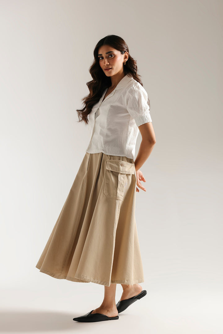 This versatile skirt is a chic and comfortable addition to any wardrobe. The long, flowing A-line silhouette in a soft beige color creates an effortless look. With its stylish utility pockets, this skirt is a perfect piece for both a relaxed and polished style.