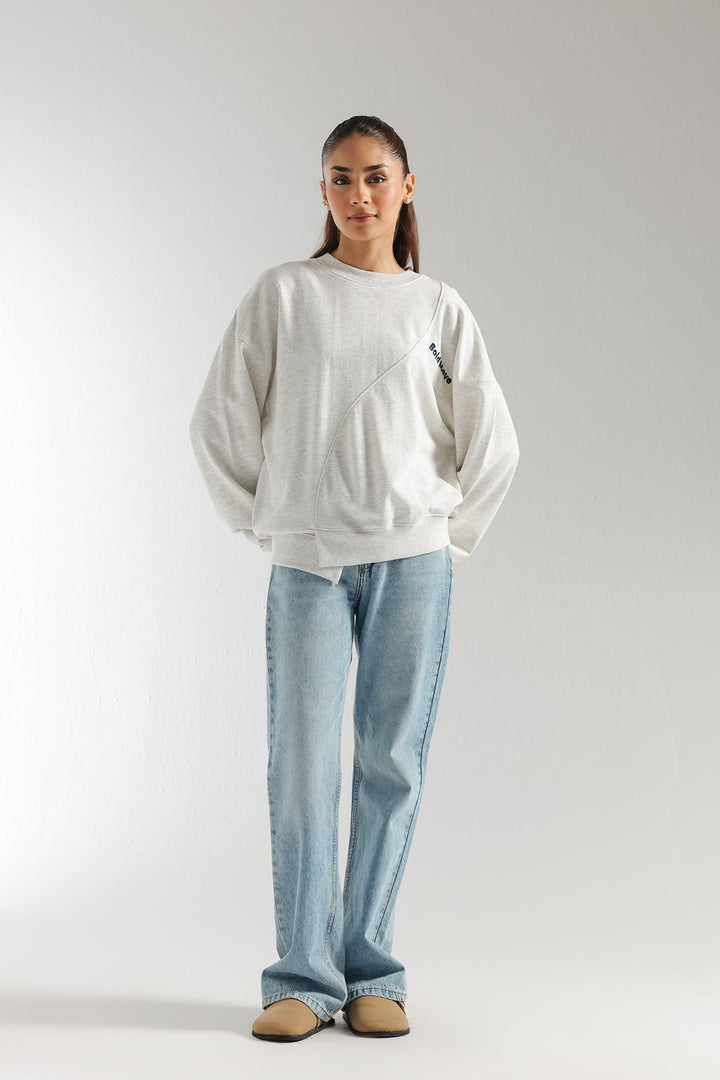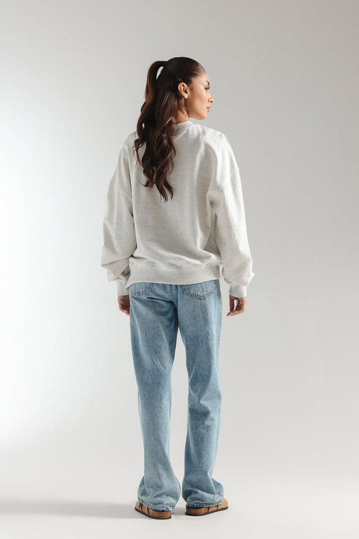 A classy yet chic design is portrayed on this elegant sweatshirt rendered in a dreamy white grey shade. It features a contemporary silhouette sweatshirt with round neck and a slit at front bottom. Adorned with text embroidered at front in contrasted black shade resulting in a fashion-forward look, making it a statement sweatshirt for fun gatherings.