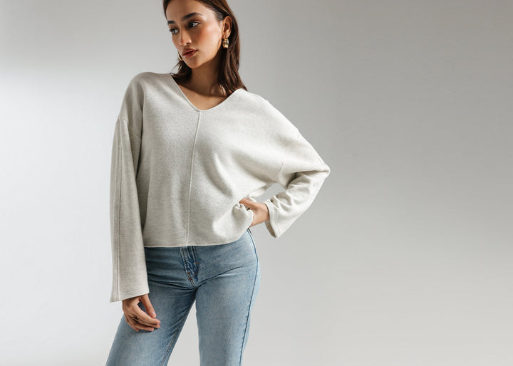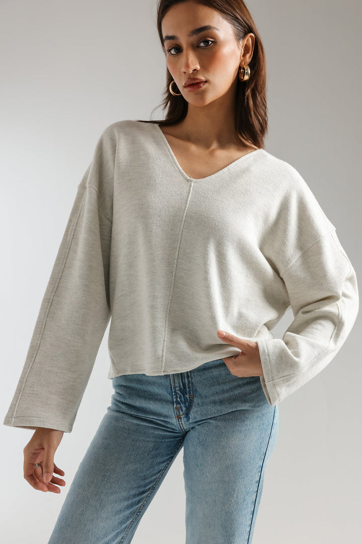 Look elegant and chic in this classy sweatshirt rendered in a light grey shade. Crafted in a contemporary silhouette with V neck and loose fit designs adorned with stitch details, this solid sweatshirt is a must have to look graceful this winter season.