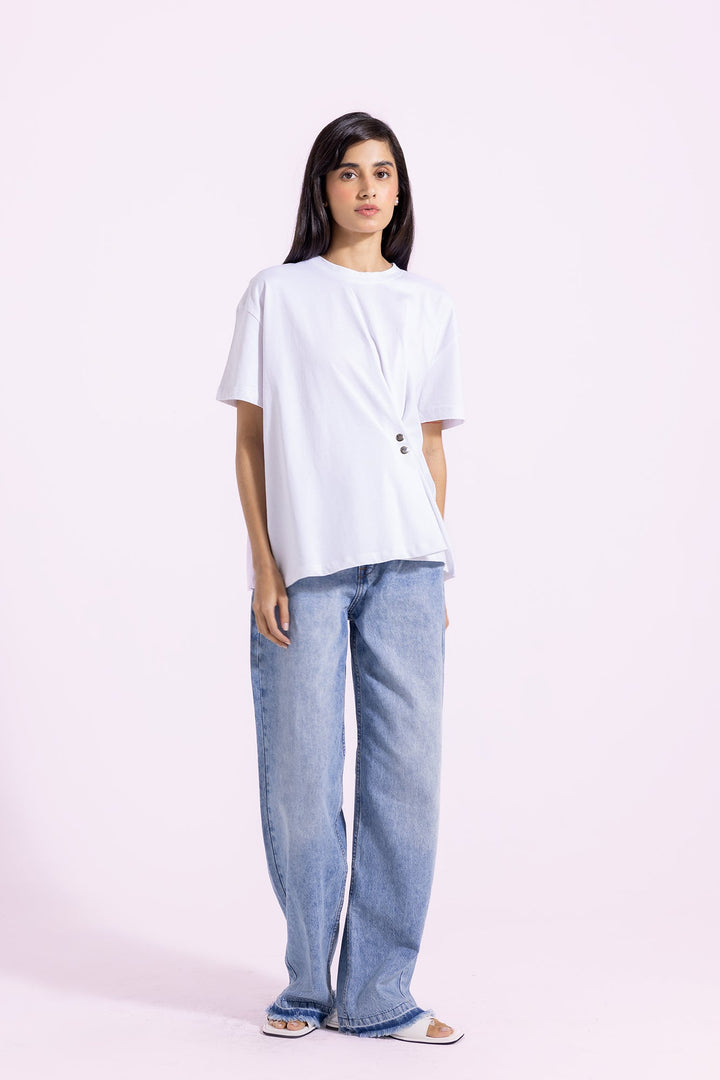 A classy celestial white shade jersey t-shirt crafted in a trendy silhouette with round neck and overlapped designs enhanced with buttons at front. Style this resplendent t-shirt at casual events this summer season.