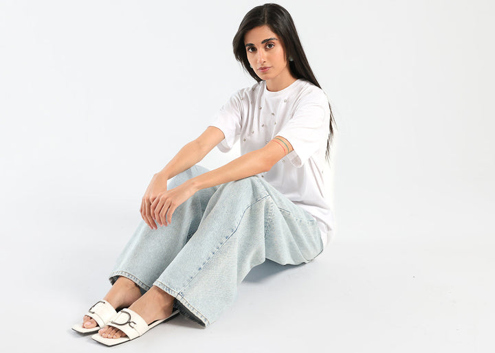 This stylish embellished t-shirt is the perfect combination of comfort and modern fashion. Crafted in jersey fabric, this t-shirt features half sleeves, a round neck, and a classic white color. The real showstopper however is embellished with beads placed at the front that elevate its look.