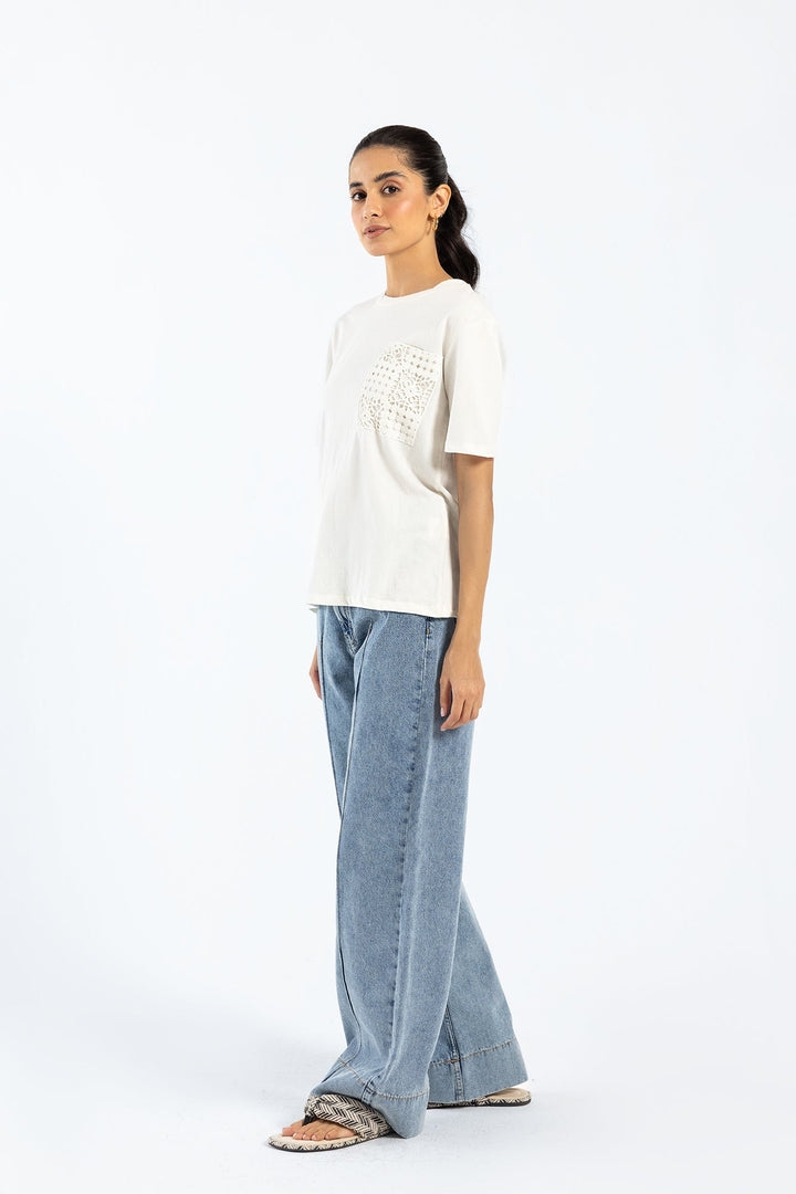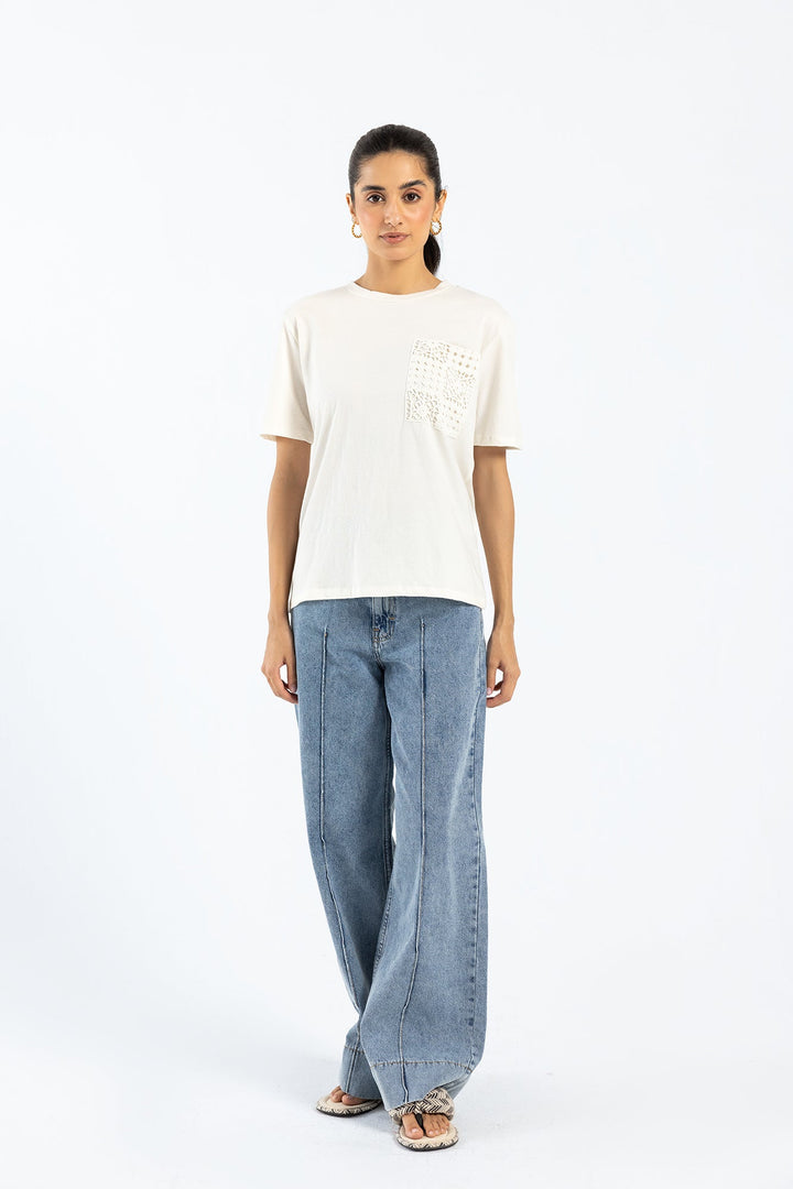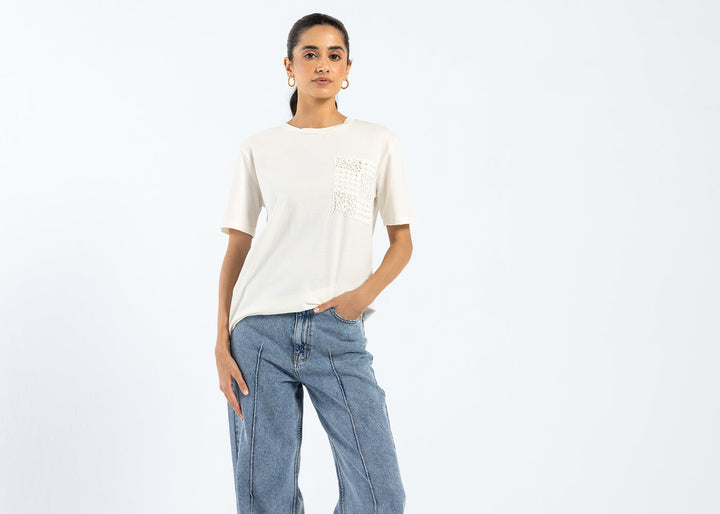 A mesmerizing white t-shirt crafted in a trendy silhouette with round neck is beautifully illustrating a solid composition. Style this contemporary t-shirt at fun events and make a statement this season