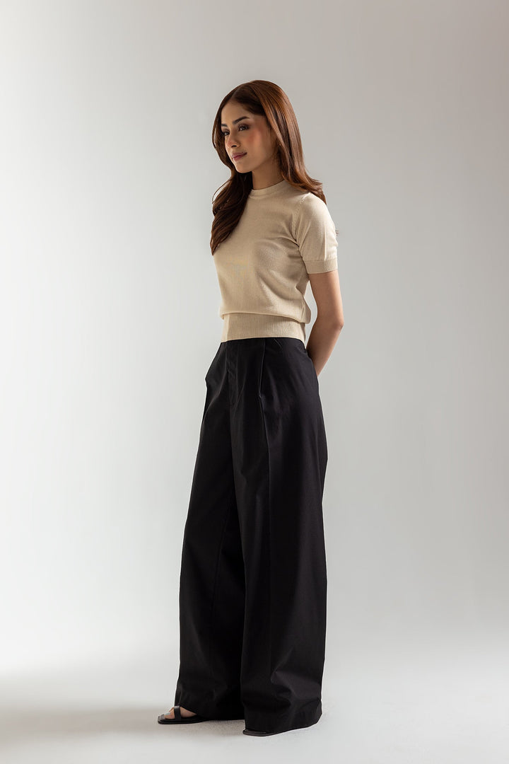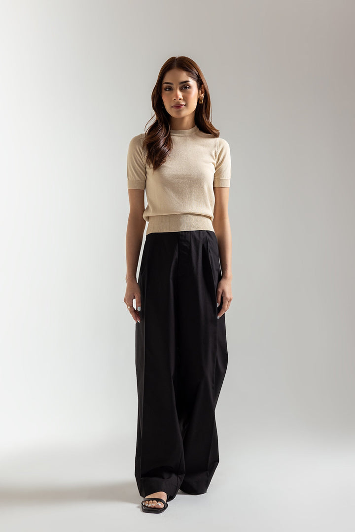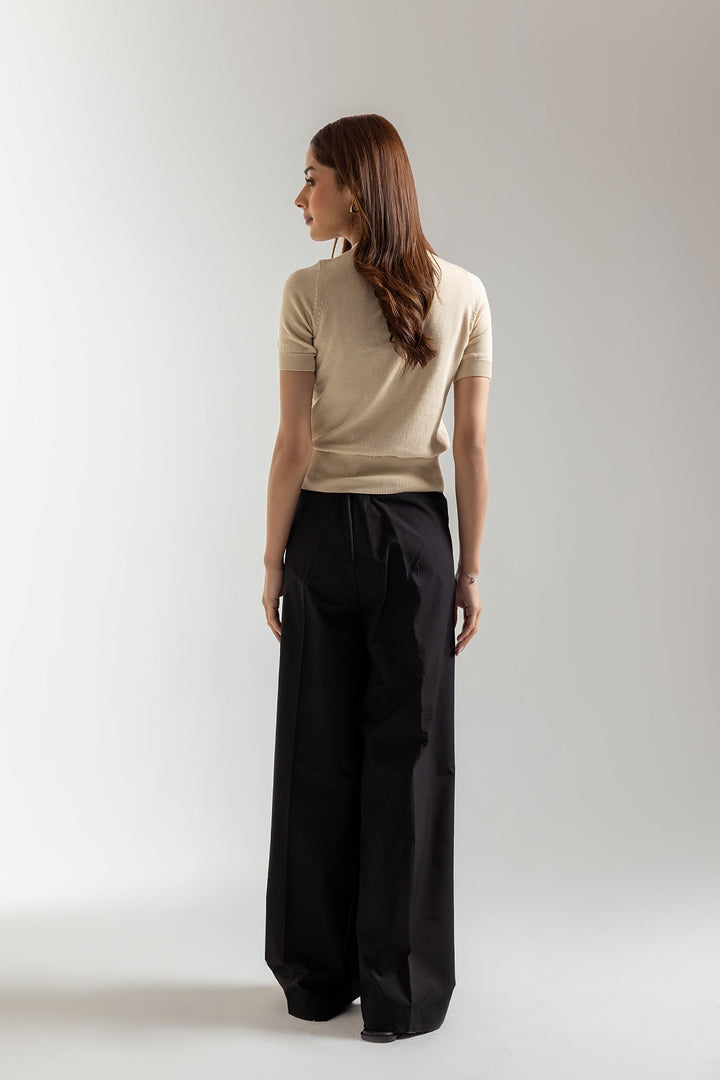 Discover a sophisticated t-shirt that is essential for any wardrobe this season. Designed with a modern mock neck silhouette, this top features a captivating solid design with ribbed sleeves and bottom hem. It's the ideal choice for any occasion and will elevate your style with its elegant and fashionable appearance.