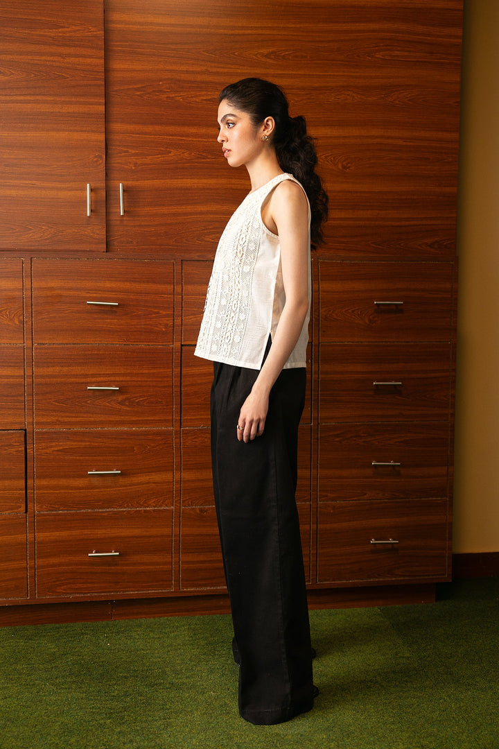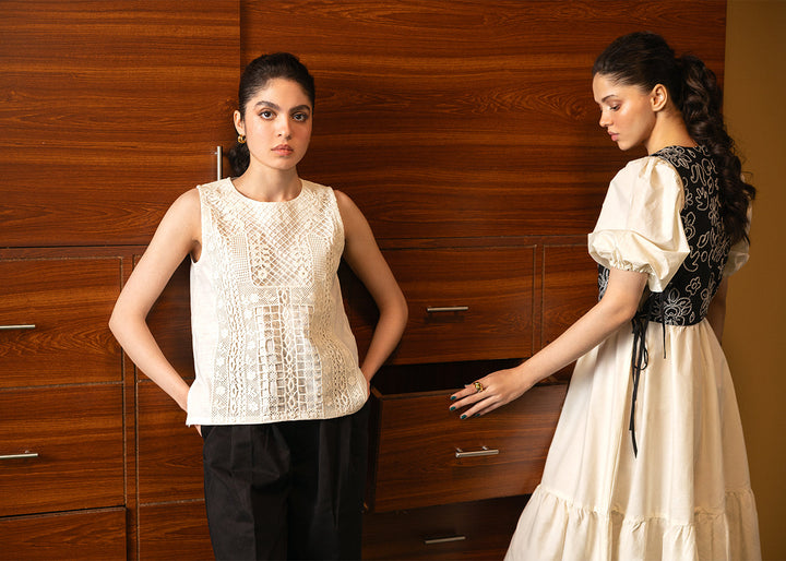 Experience the timeless elegance in this classy sleeveless top rendered in a creamy color. Adorned with intricate embroidery at front portraying floral design with cutwork details,, this beautiful top is a perfect option for happening events.