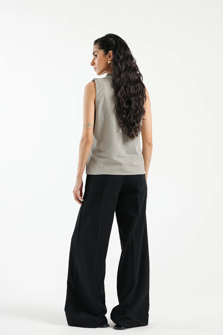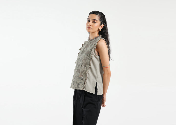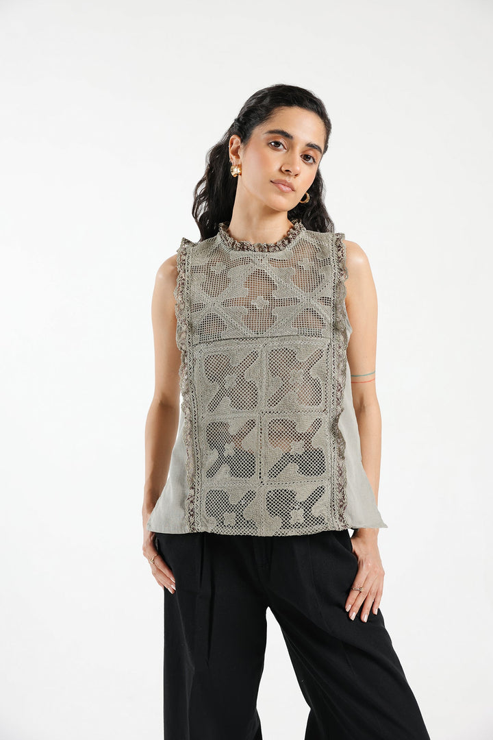 Experience the timeless elegance in this classy sleeveless top rendered in a subtle khaaki color. Adorned with intricate embroidery at front portraying floral design with cutwork details and enhanced with delicate lace, this beautiful top is a perfect option for happening events.