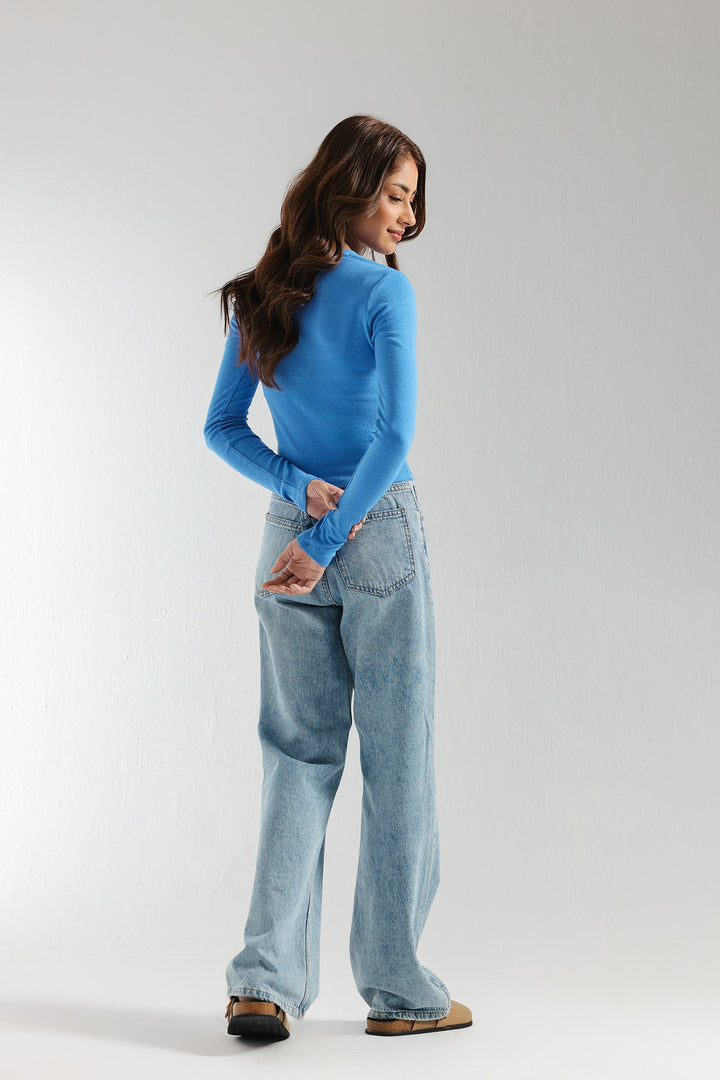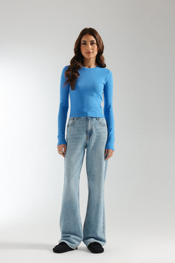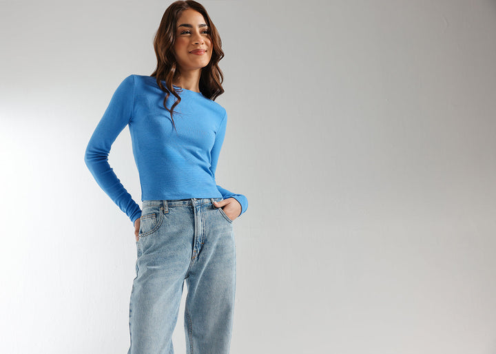 A mesmerizing classy blue top crafted in a trendy cropped silhouette with round neck is beautifully illustrating a solid composition with full sleeves. Style this contemporary top at fun events and make a statement this season