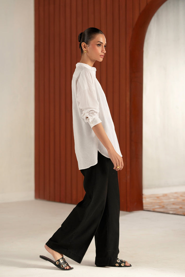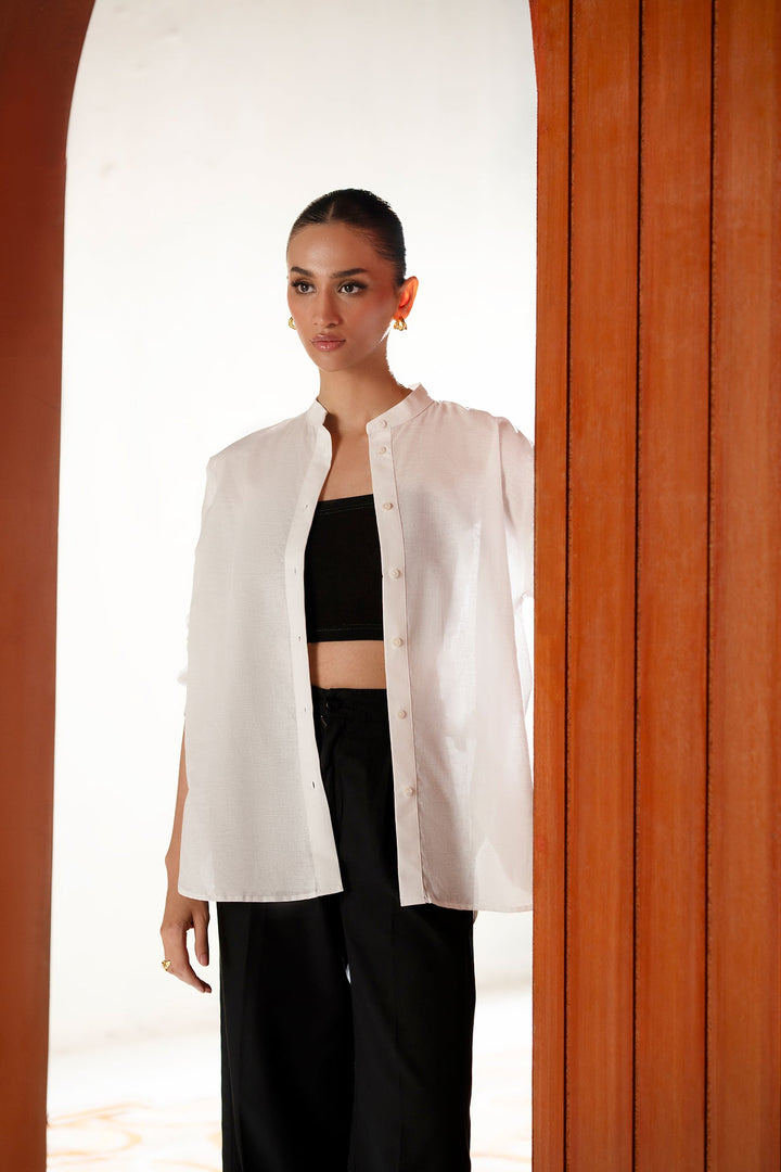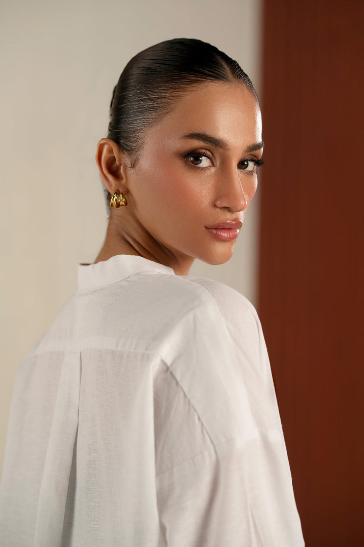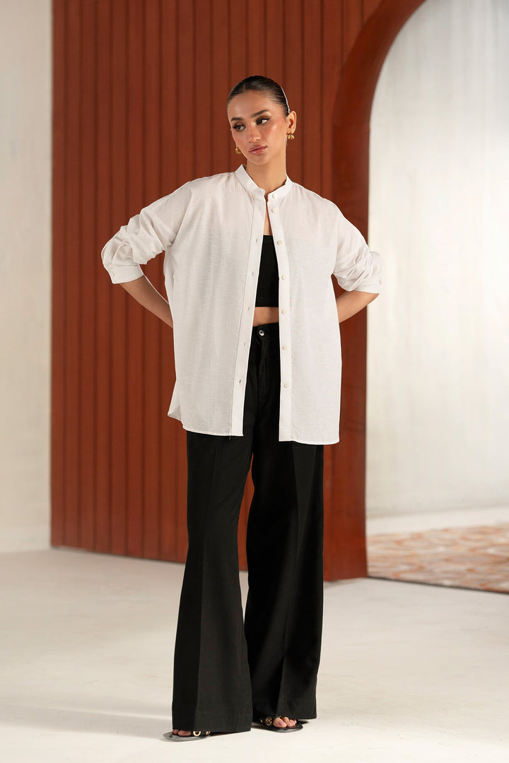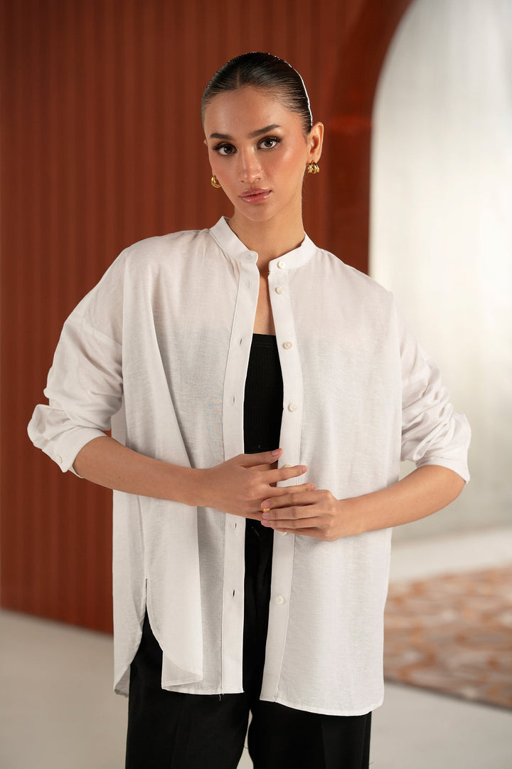 A classy yet elegant composition is portrayed on this trendy shirt rendered in an attractive white color. Crafted in a chic button down silhouette with ban neck and illustrating contemporary design with round hem. This contemporary shirt is a perfect option to style at fun occasions this summer season.