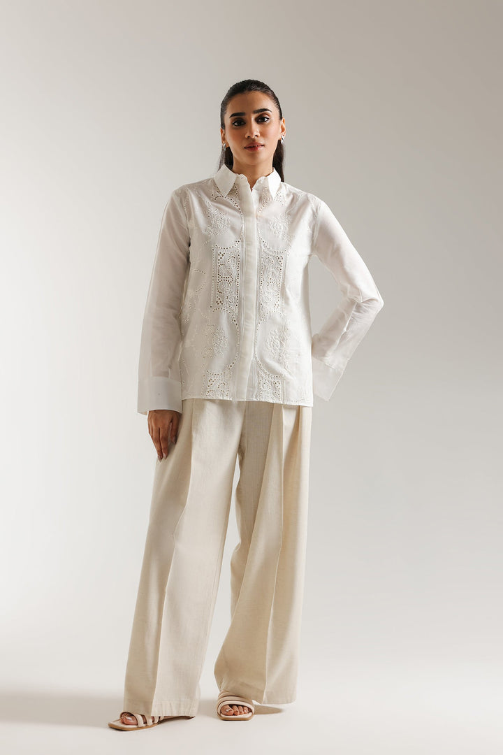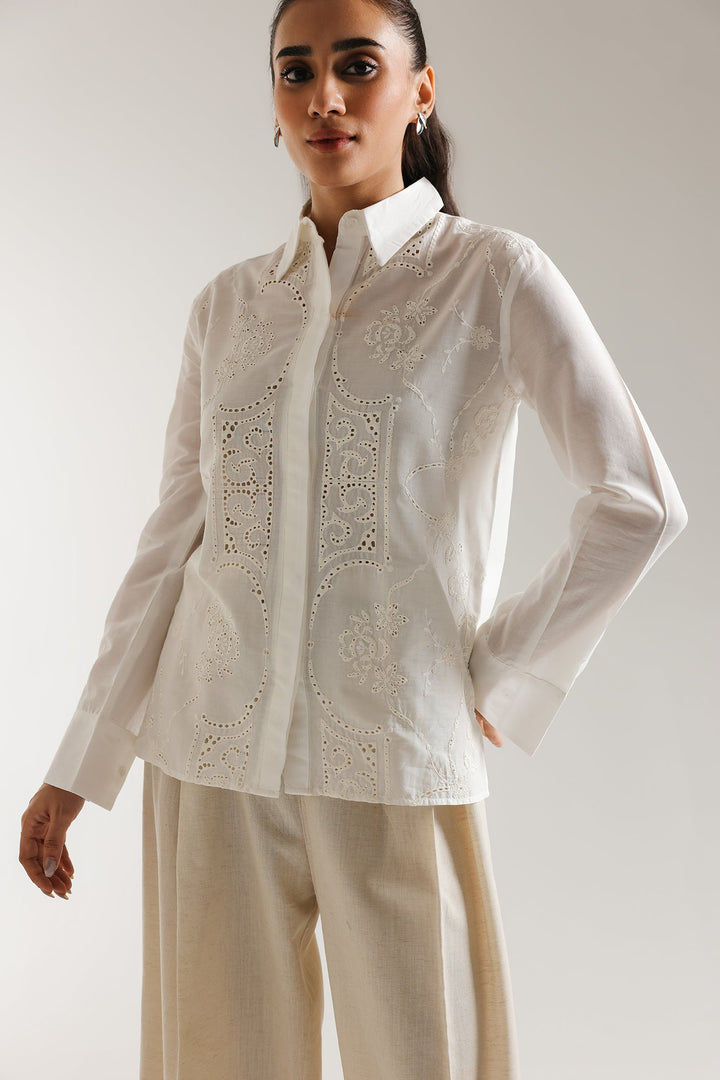 Elevate your everyday look with this chic white shirt. The subtle yet eye-catching pattern on its classic button-down silhouette adds a touch of texture and visual interest, offering versatile styling options. Pair it with relaxed-fit denim jeans or a wide leg trouser for a laid-back aesthetic that's both stylish and comfortable.