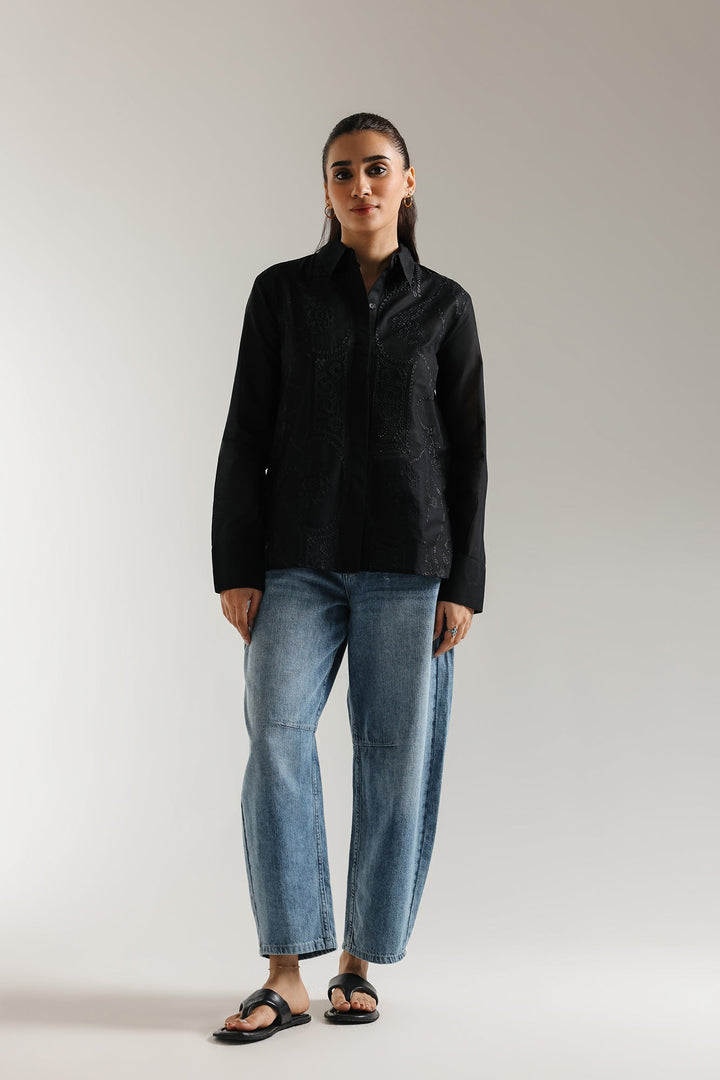 Elevate your everyday look with this chic black shirt. The subtle yet eye-catching pattern on its classic button-down silhouette adds a touch of texture and visual interest, offering versatile styling options. Pair it with relaxed-fit denim jeans for a laid-back aesthetic that's both stylish and comfortable.