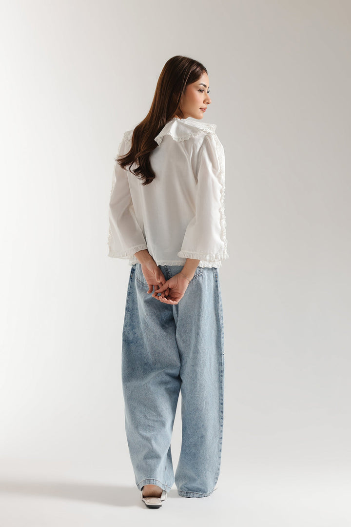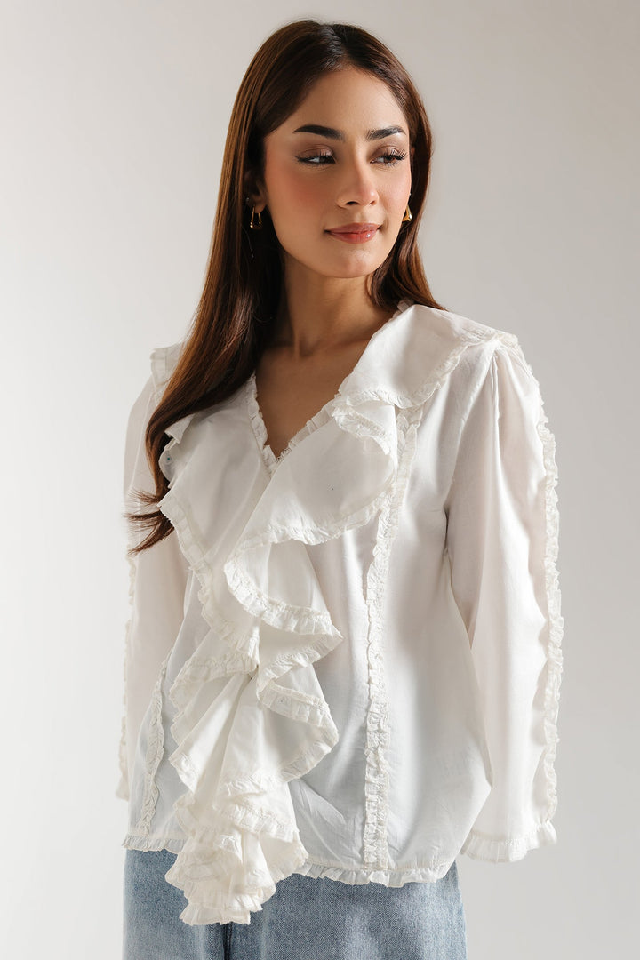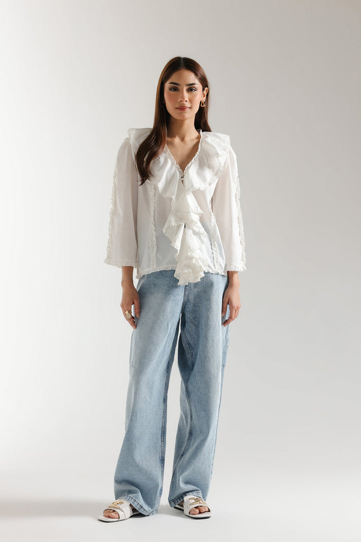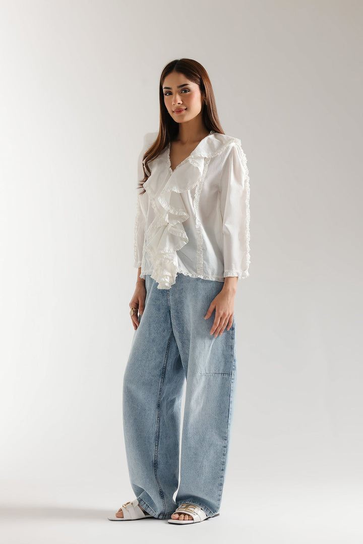 An aesthetically rich composition is portrayed on this trendy shirt rendered in a classy white color. Crafted in a chic button down silhouette illustrating a classy design with frills illustrating a mesmerizing design. This contemporary top is a perfect option to style at fun occasions this summer season.