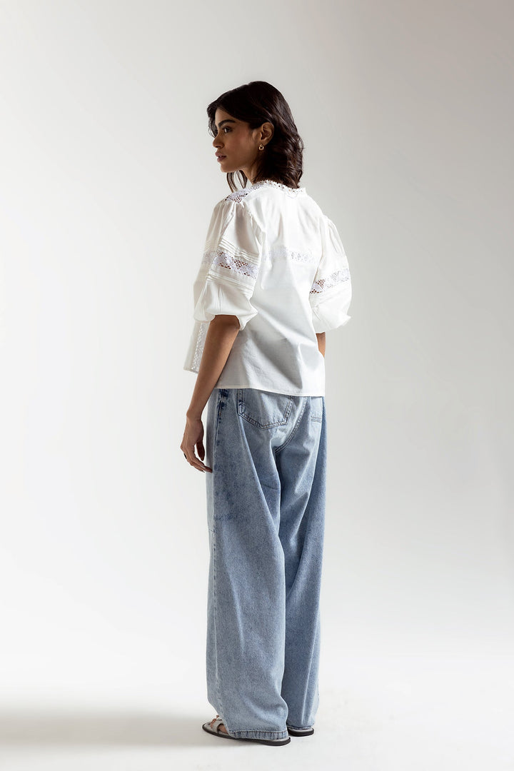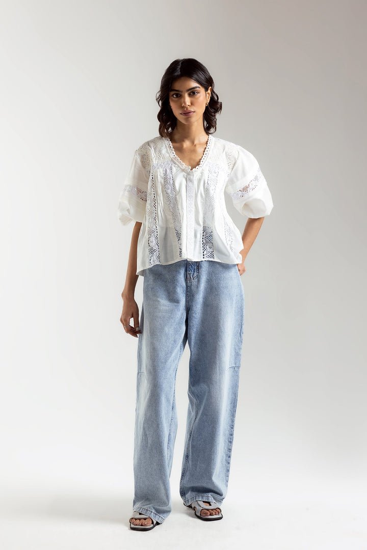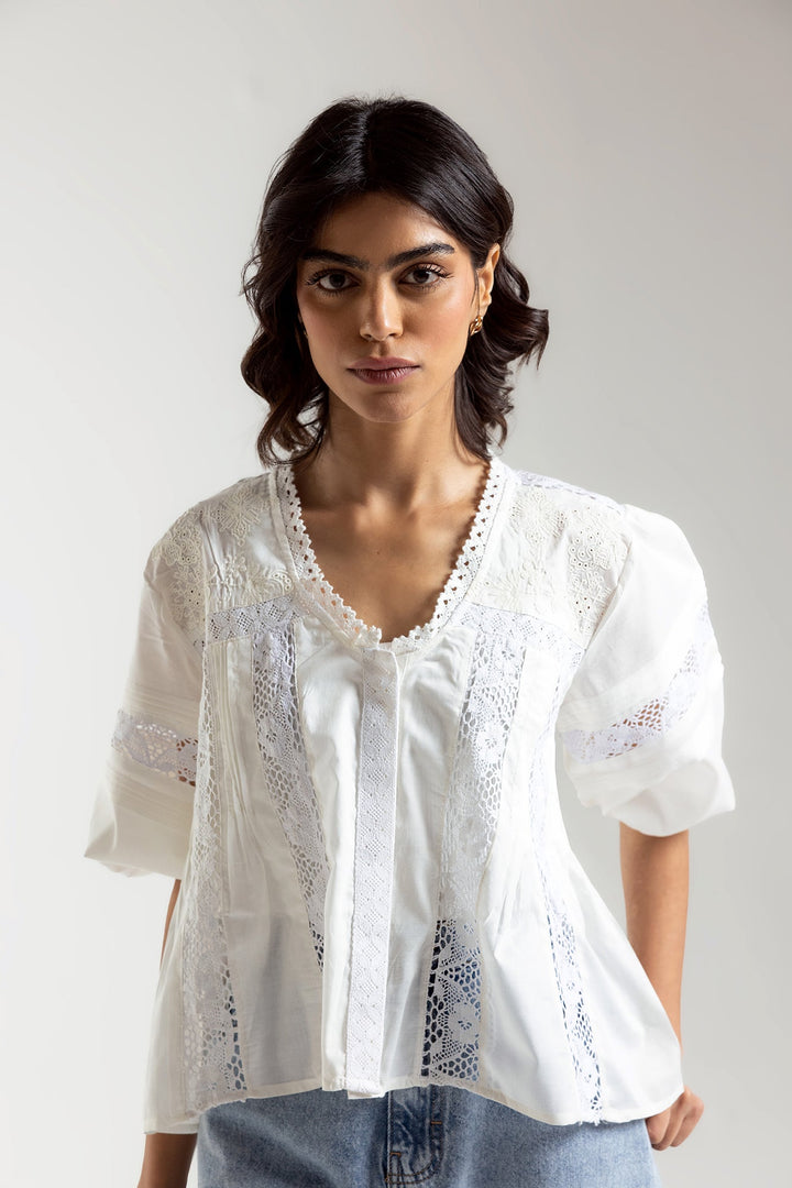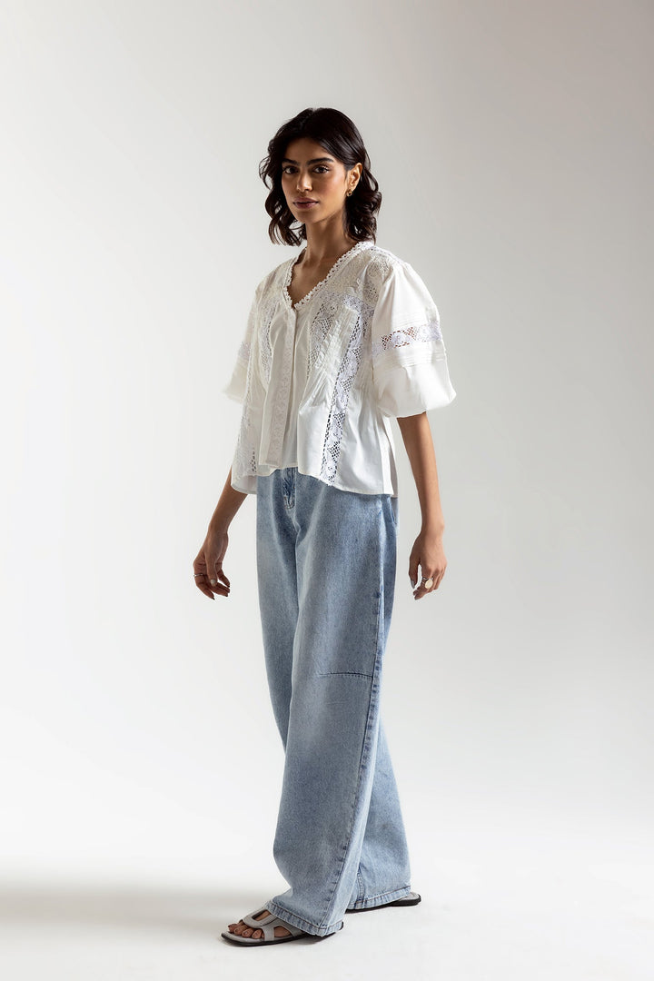 This white shirt is chic, sophisticated, and perfect for fun occasions. It features a V neck with delicate floral lace and enriched with intricate embroidery that adds a trendy touch to the loose sleeves and contemporary silhouette. Made from a premium fabric, this shirt is a must-have for any wardrobe.