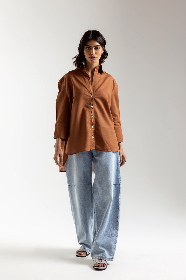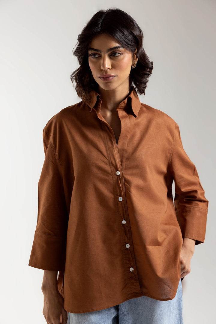 Effortlessly chic and stylish, this lightweight button down top boasts a beautiful brown color and intricate design. crafted in a trendy textured fabric and quarter sleeves, this modern piece is perfect for any upcoming fun occasion. Elevate your wardrobe with this trendy top.