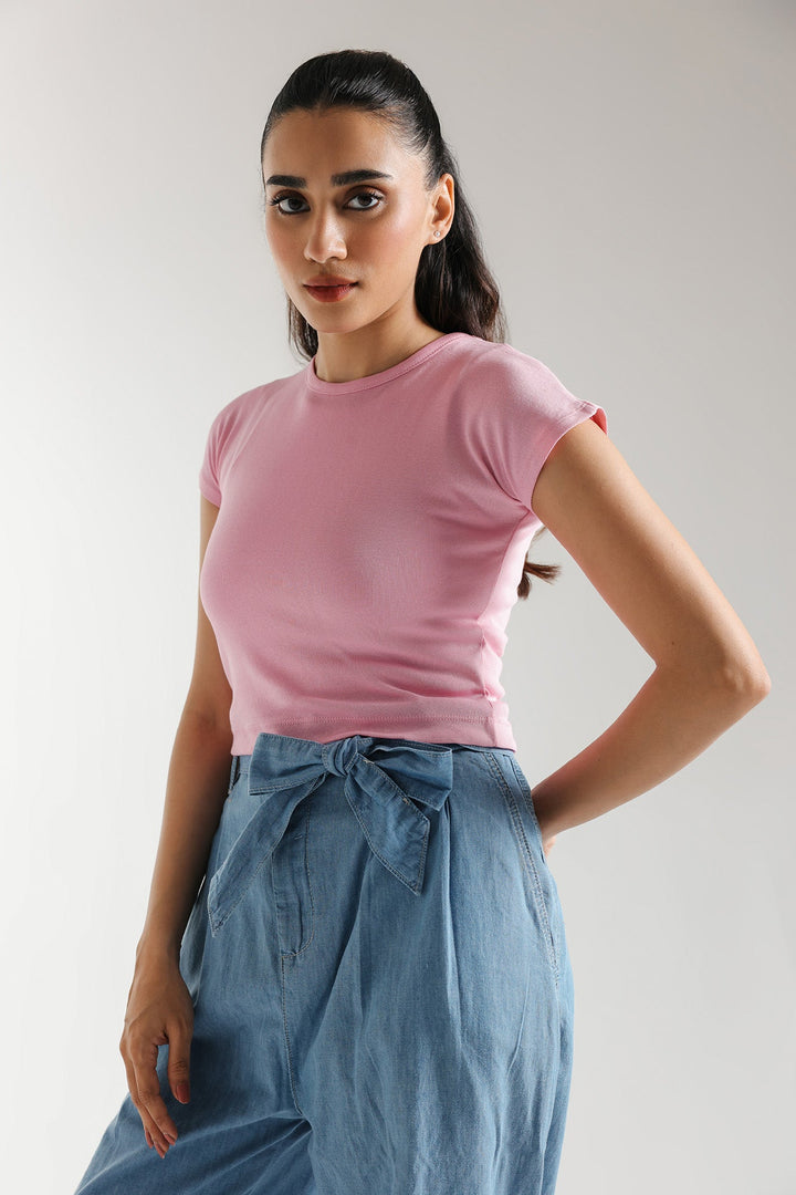 A mesmerizing classy top crafted in a trendy cropped silhouette with round neck is beautifully illustrating a solid composition. Style this contemporary t-shirt at fun events and make a statement this season.