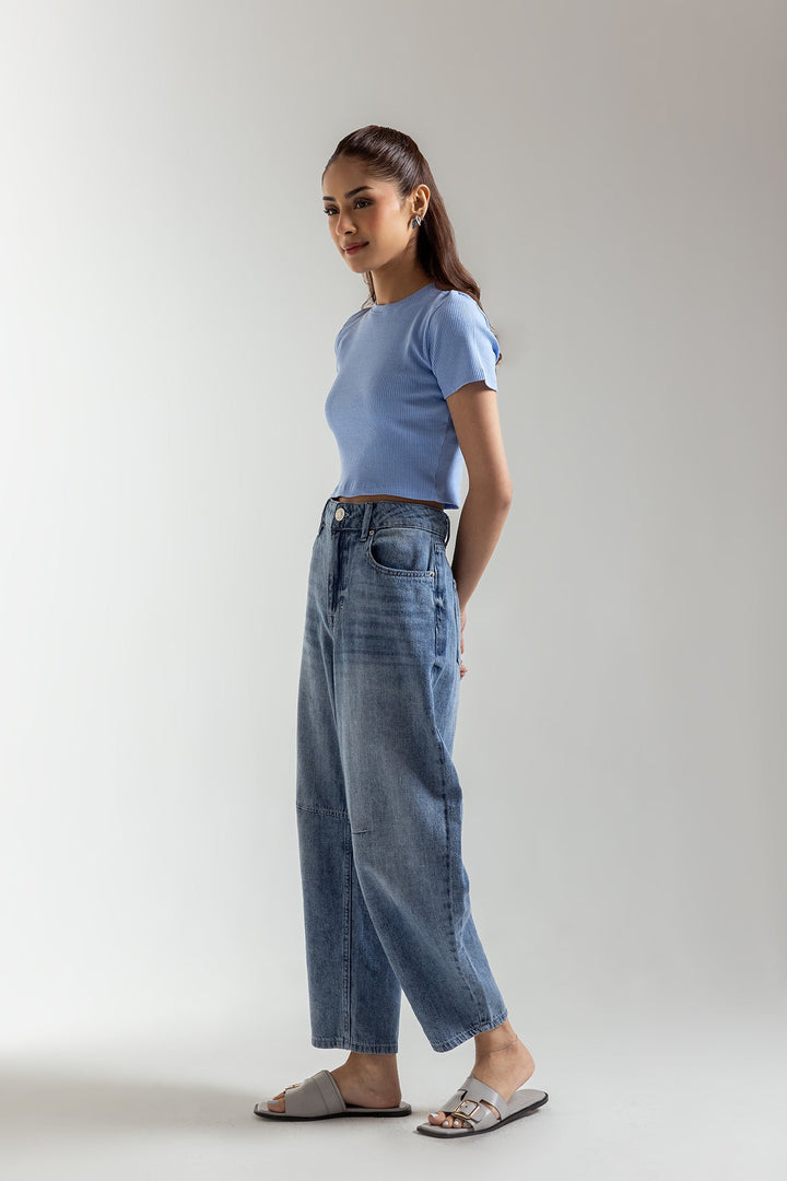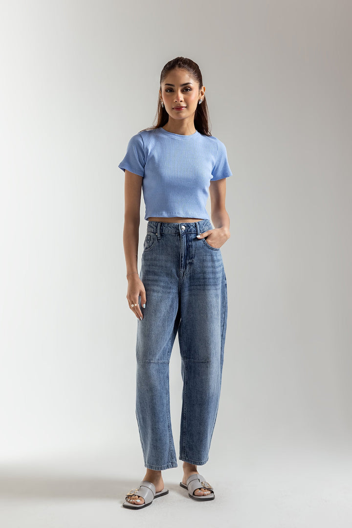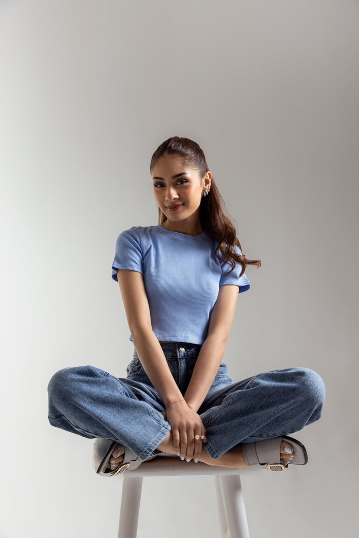Add a refreshing pop of color to your wardrobe with this vibrant blue top. The slim fit and short sleeves create a classic and versatile silhouette. The subtle ribbed texture adds a touch of visual interest, making it a stylish yet comfortable choice for everyday wear. Pair it with high-waisted trousers or your favorite denim for an effortlessly chic look.