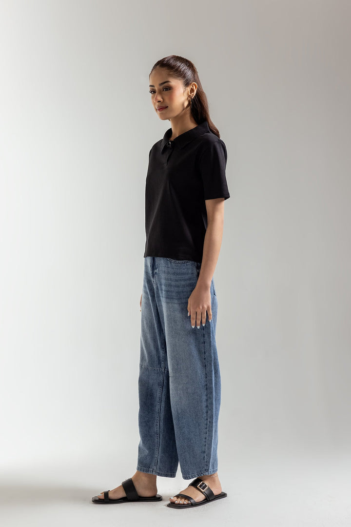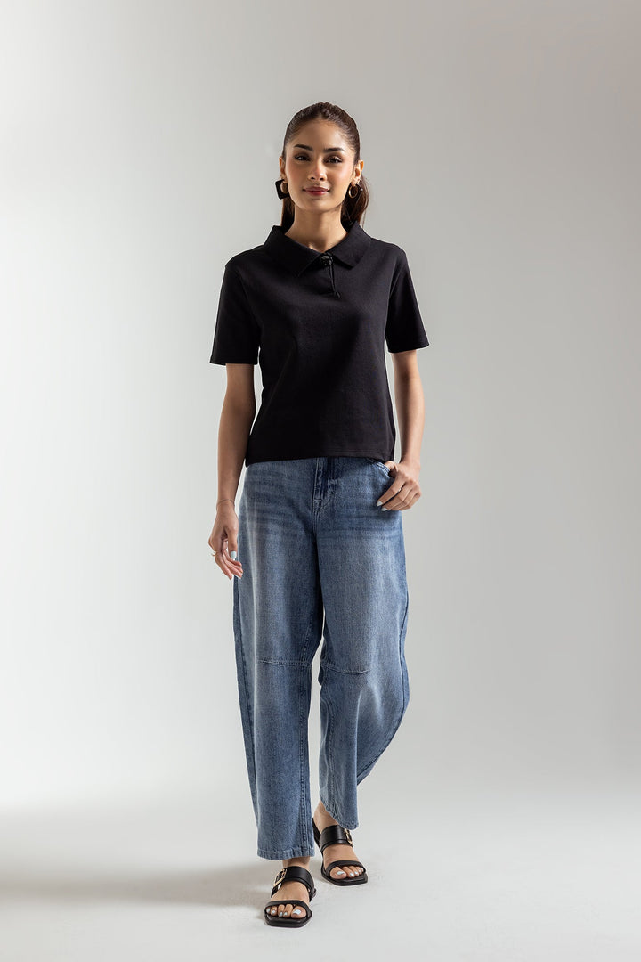 Elevate your casual style with this sophisticated black knit polo top. Crafted with a fine knit texture, this short-sleeved top features a classic polo collar with a unique, eye-catching button detail. The tailored fit offers a polished yet comfortable look, making it a versatile piece for both everyday wear and smart-casual occasions. Pair it with tailored trousers or a skirt for an effortlessly chic ensemble. -Black Color