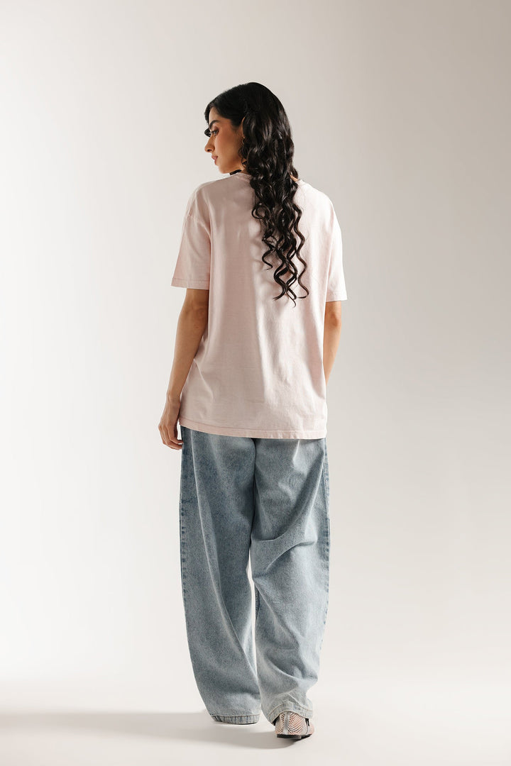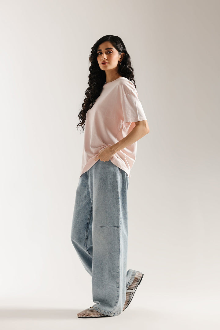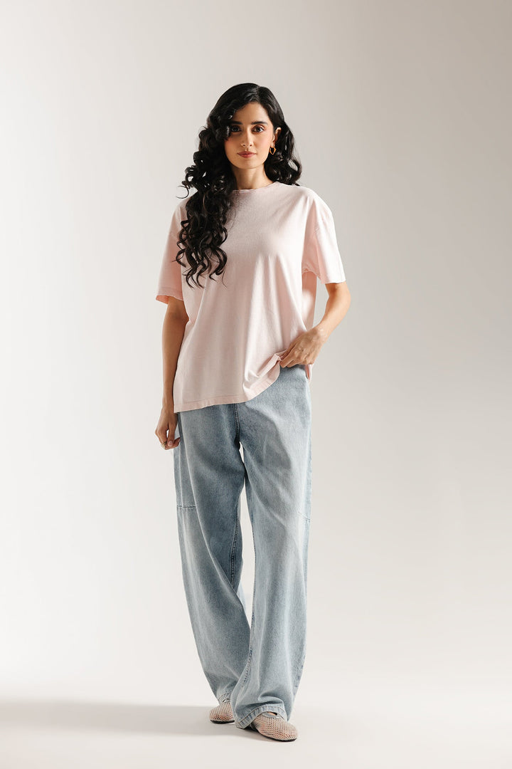 This essential T-shirt is a foundational piece for any casual look. Made from a soft, breathable fabric in a delicate pink shade, it offers a relaxed fit that drapes effortlessly. Its simple, classic design makes it incredibly versatile, perfect for pairing with your favorite trousers or jeans for a clean and comfortable style.