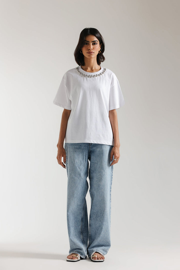 Experience the allure of a stylish and sophisticated top adorned with a round neck and sleek silhouette. It features a beautiful composition embellished with dazzling beads at front neck that adds a touch of elegance to this modern design. Elevate your look at any event and stand out this season.