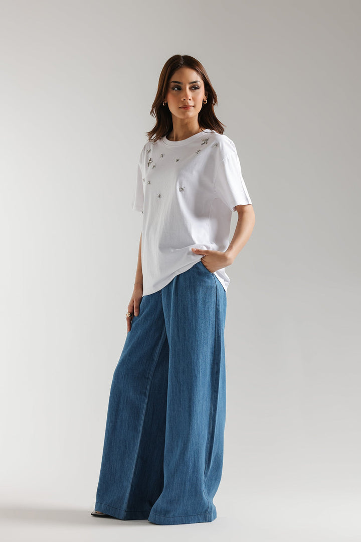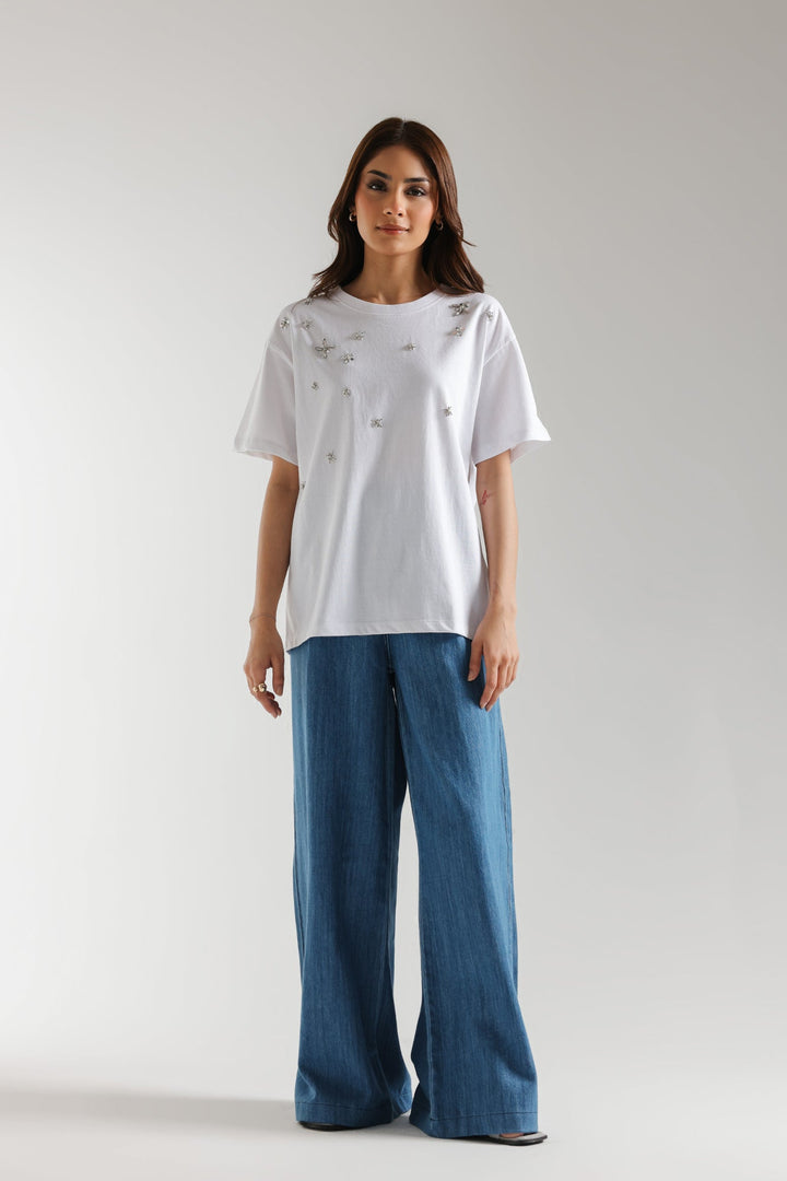 Elevate your style with this chic and refined top, featuring a round neck and sleek silhouette. Adorned with dazzling beads at front illustrating floral pattern, this modern design exudes elegance and charm. Perfect for any occasion, stand out in sophistication this season.
