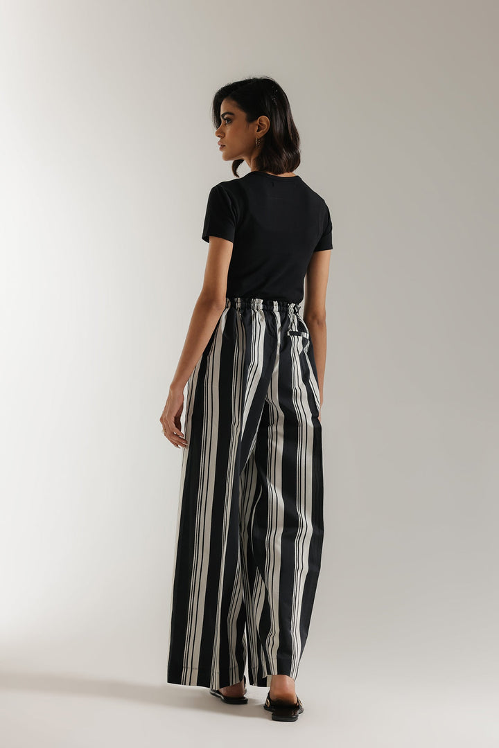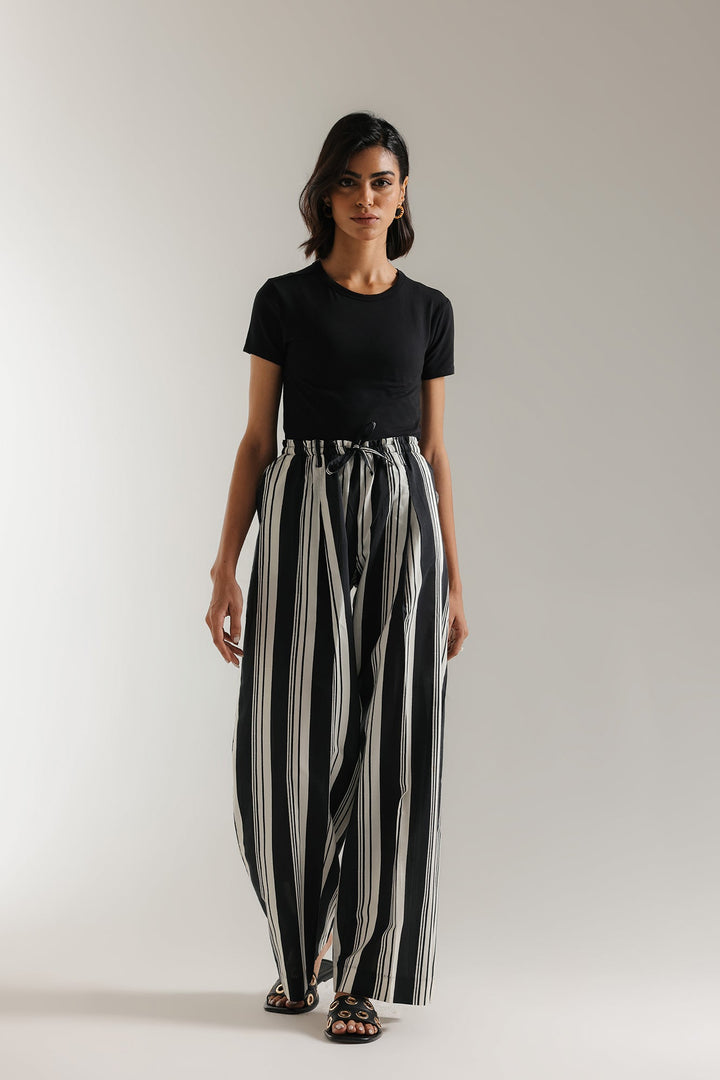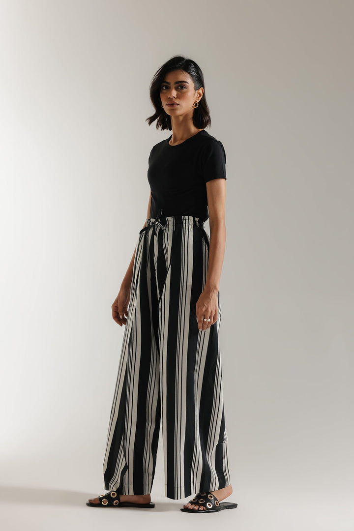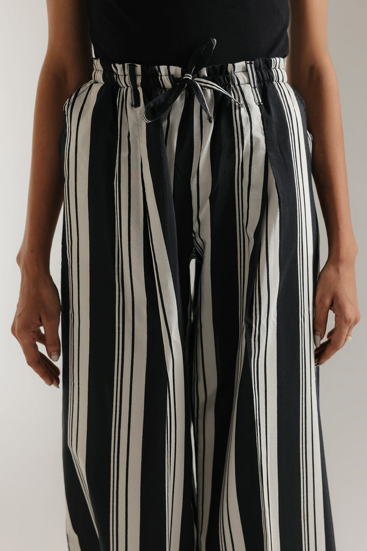 Make a stylish statement with these sophisticated wide-leg trousers, featuring bold vertical black and white stripes that elongate the silhouette. Designed for both comfort and style, these trousers boast a relaxed, flowing fit and a high-waisted design with an adjustable tie-front detail for a custom fit. The classic striped pattern offers versatile styling options, perfect for creating both casual and elevated looks. Pair them with a simple tee for an effortless daytime outfit or dress them up with a blouse and heels for a more polished ensemble. A must-have addition to any contemporary wardrobe.