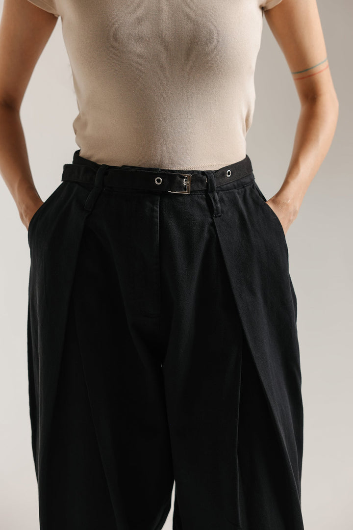 Channel contemporary chic with these bold and versatile black trousers. These trousers feature a flattering high-waist silhouette with a structured waistband and belt loops. The design is characterized by deep pleats that fall into an exceptionally wide-leg cut, offering dramatic volume and comfortable movement. Crafted in solid black, they are a powerful statement piece that instantly elevates any outfit.