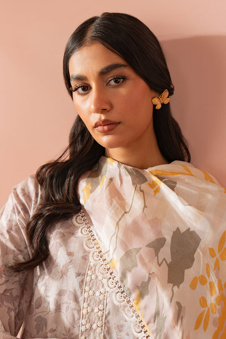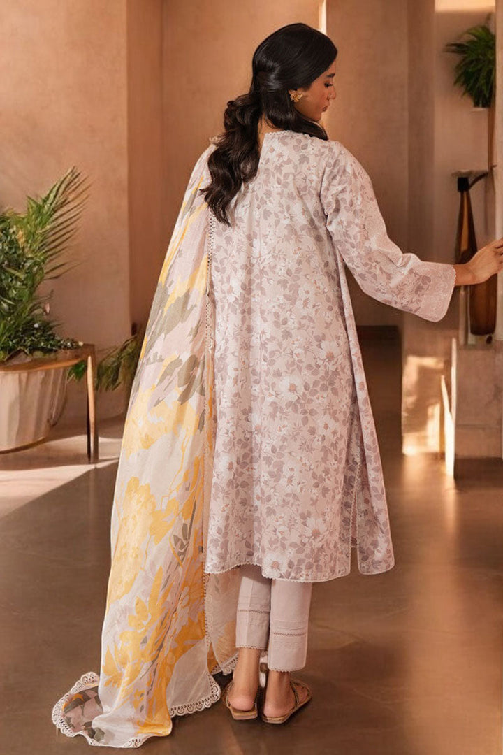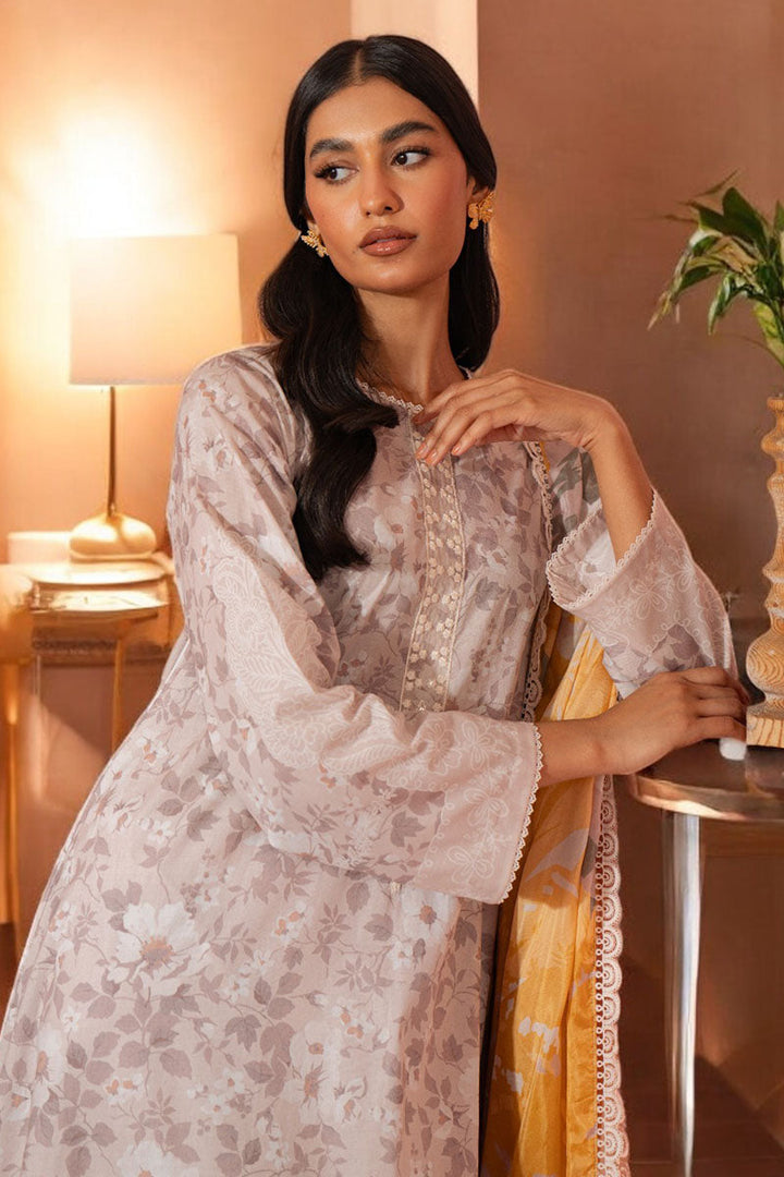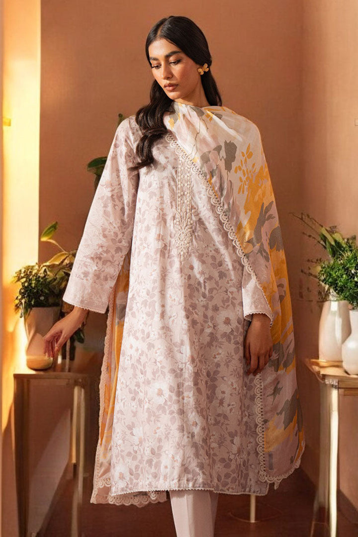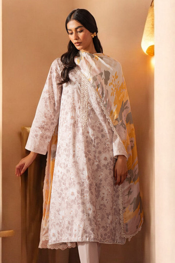 - Introducing our Whisper Pearl-3 piece printed suit, including a printed shirt with 1 embroidered neckline, a dyed cambric trouser, and a silk printed dupatta. Elevate your style with this elegant and versatile ensemble. Perfect for any occasion, this suit is both luxurious and comfortable.