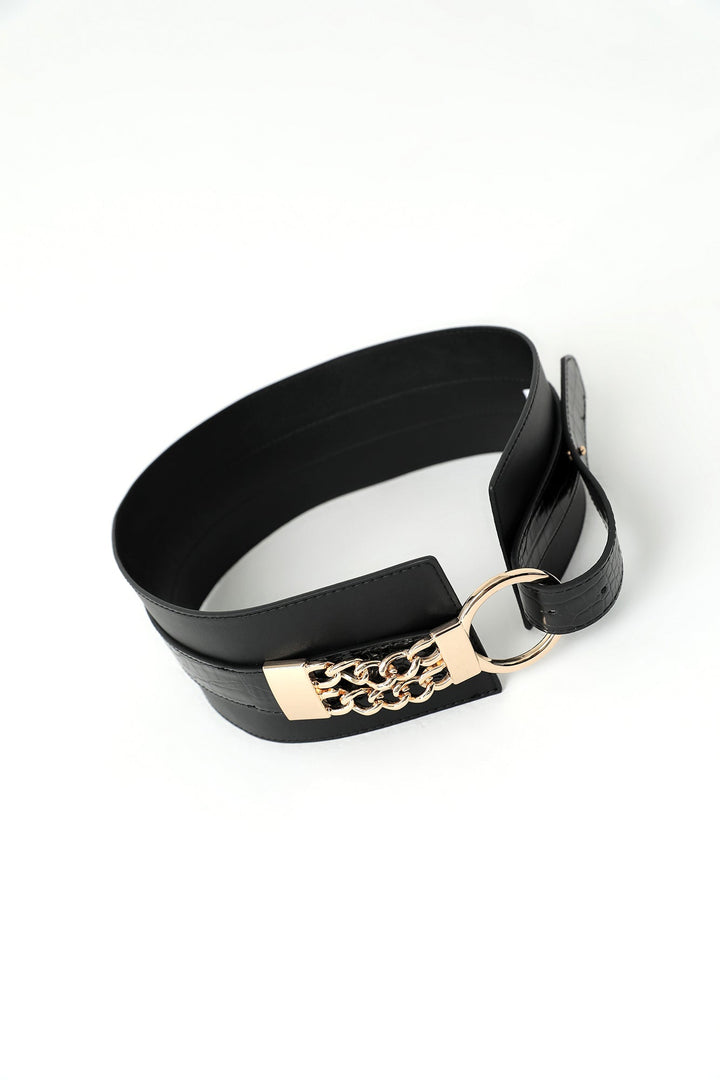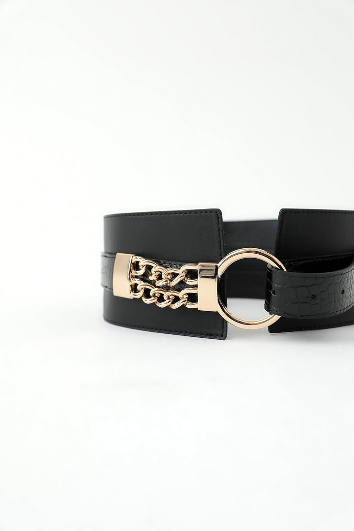 A trendy design is portrayed on this elegant belt adorned with thick strap amalgamated with a thin strap overlapped and fastened with gold delicate chain buckle. Style this statement belt with fashionable outfits this happening season.