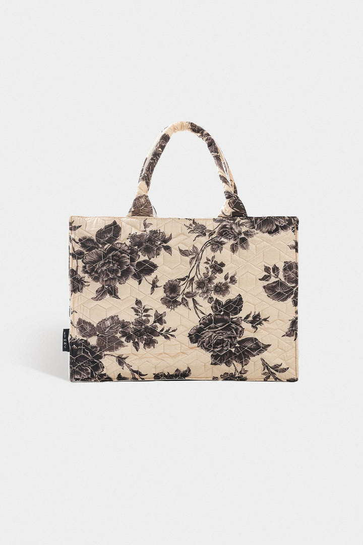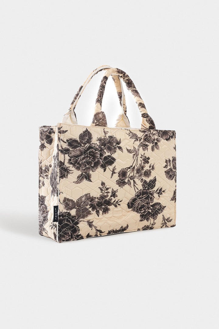 This bag features elegant black flowers on a white background, creating a versatile and stylish tote bag. It offers both functionality and a touch of sophistication. Perfect for everyday use or special occasions, this bag is a must-have for any fashion-forward individual.