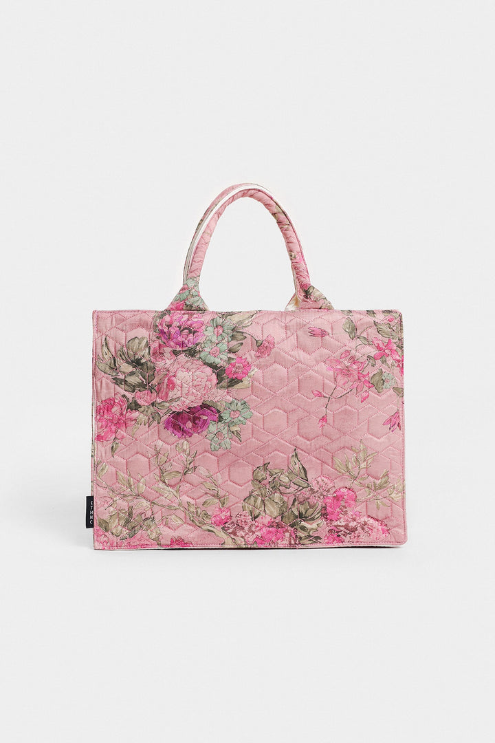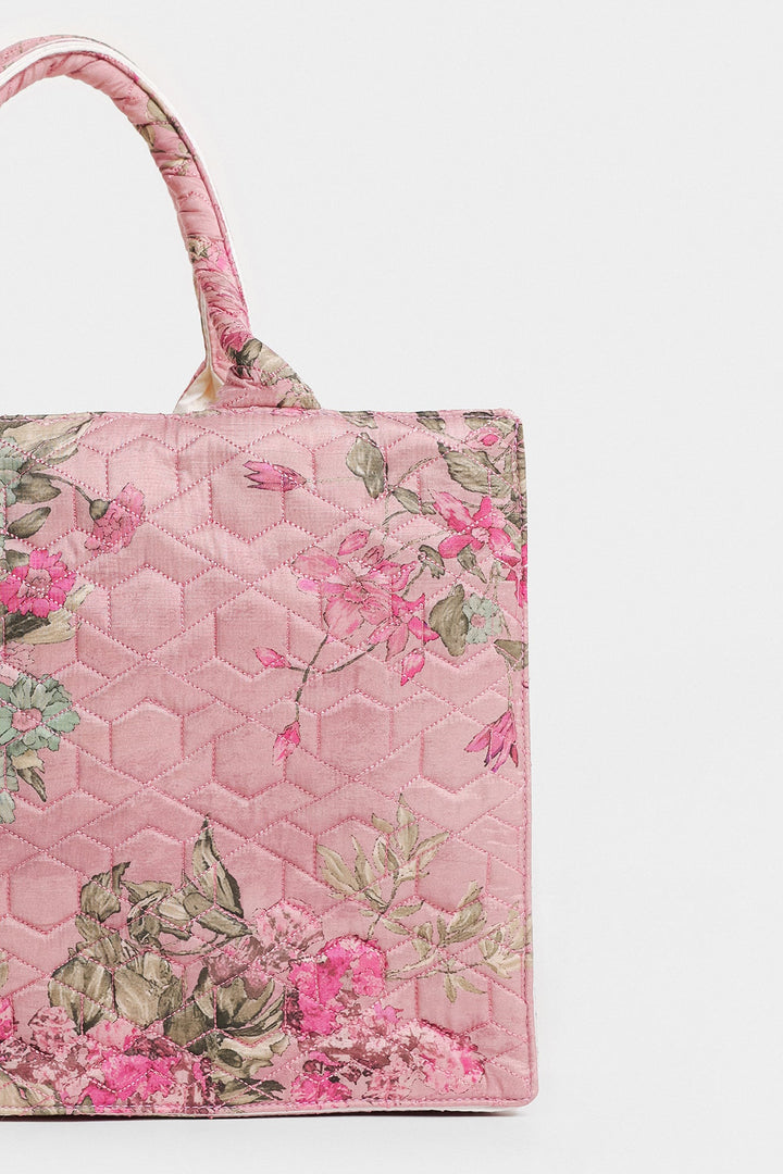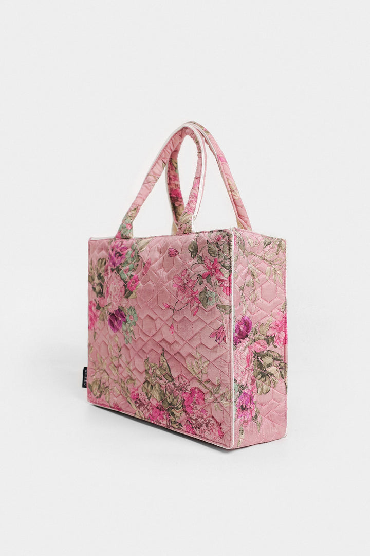 A pink quilted handbag with a floral pattern. It has two handles and appears to be made of a soft fabric, likely with some padding or quilting to give it texture. The floral design includes various shades of pink and green. The bag has a rectangular shape and seems to be stylish.