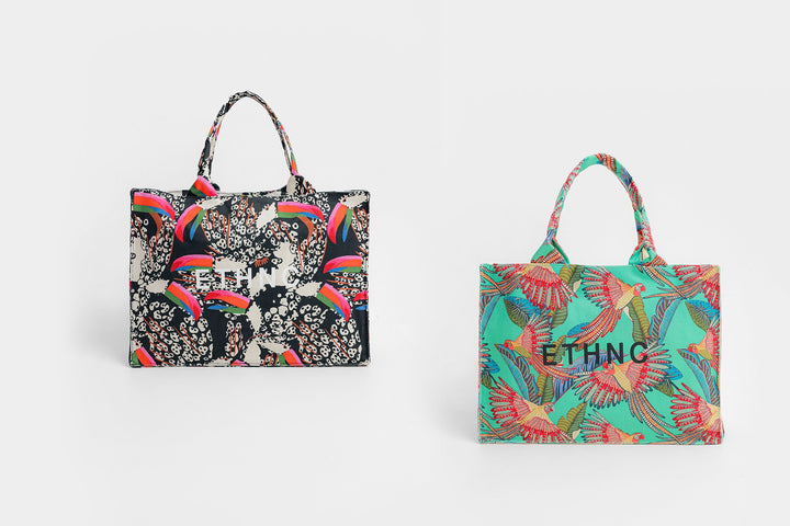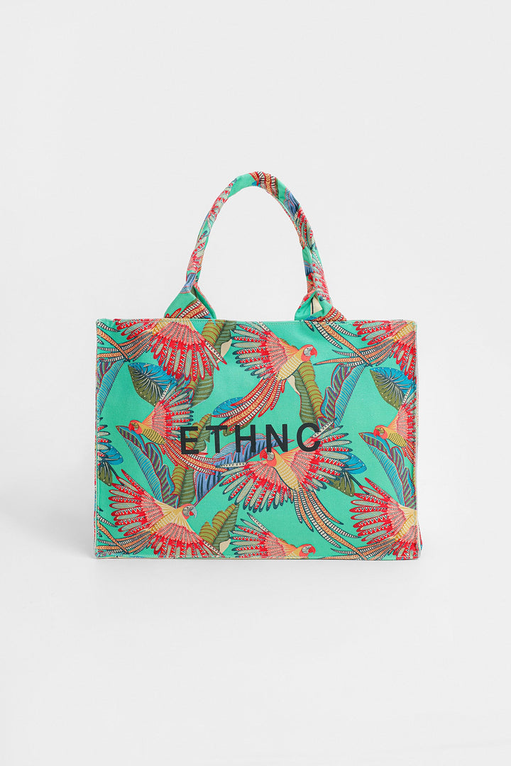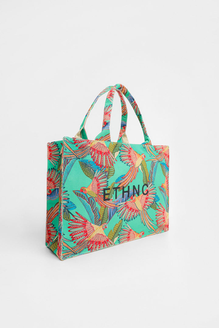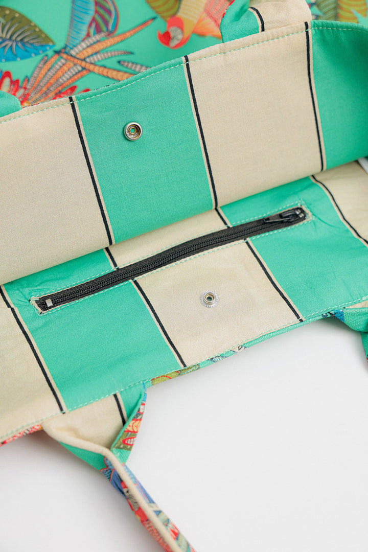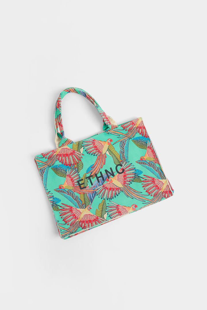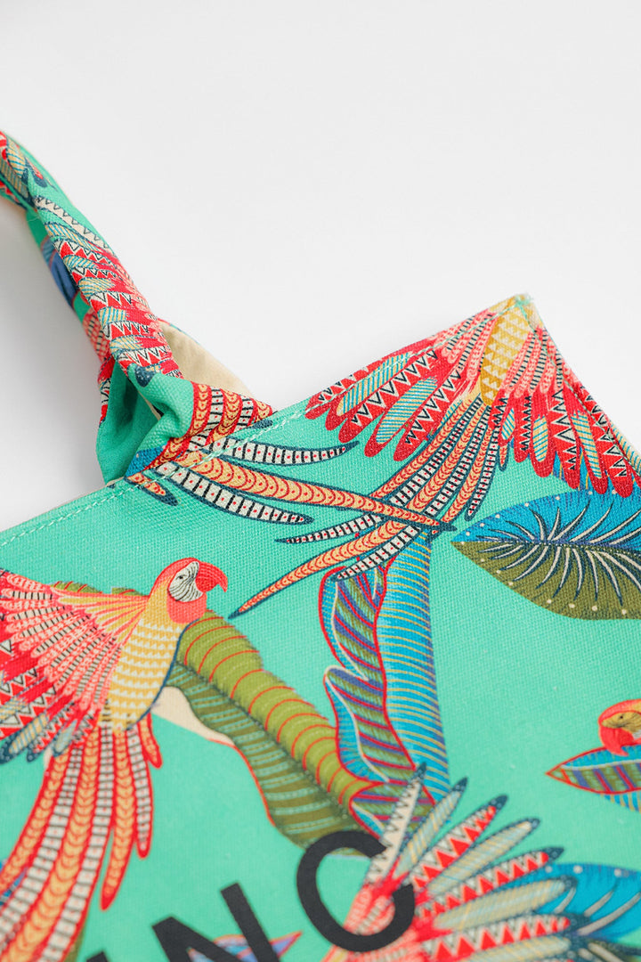 Introducing the classy canvas bag rendered in an appealing dark sea green shade and is detailed with beautiful bird illustrations printed in vibrant hues. The trendy bag is a great addition to your accessories' collection.