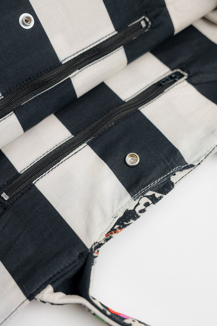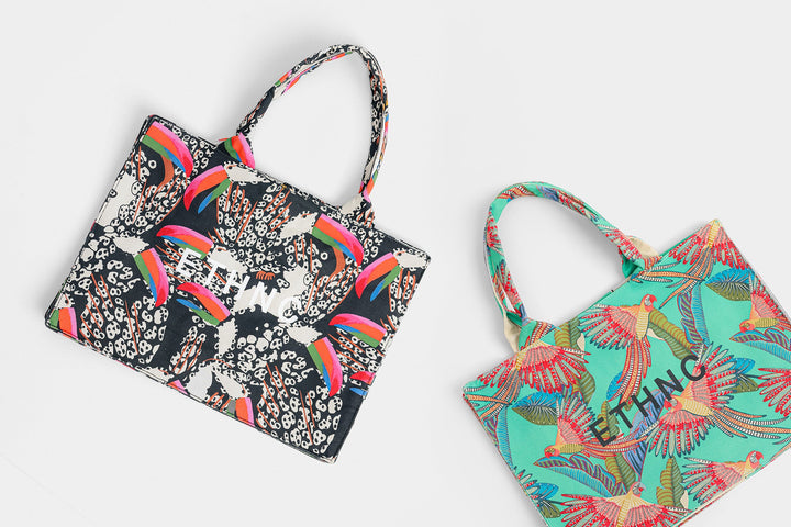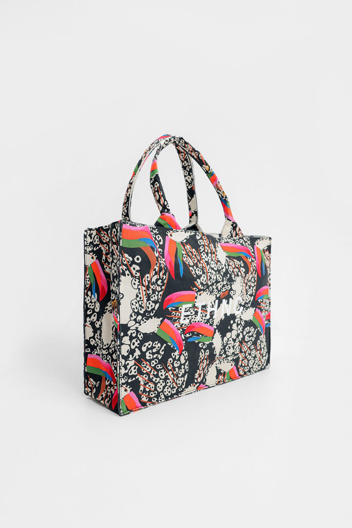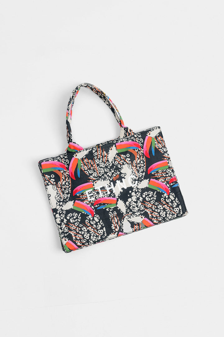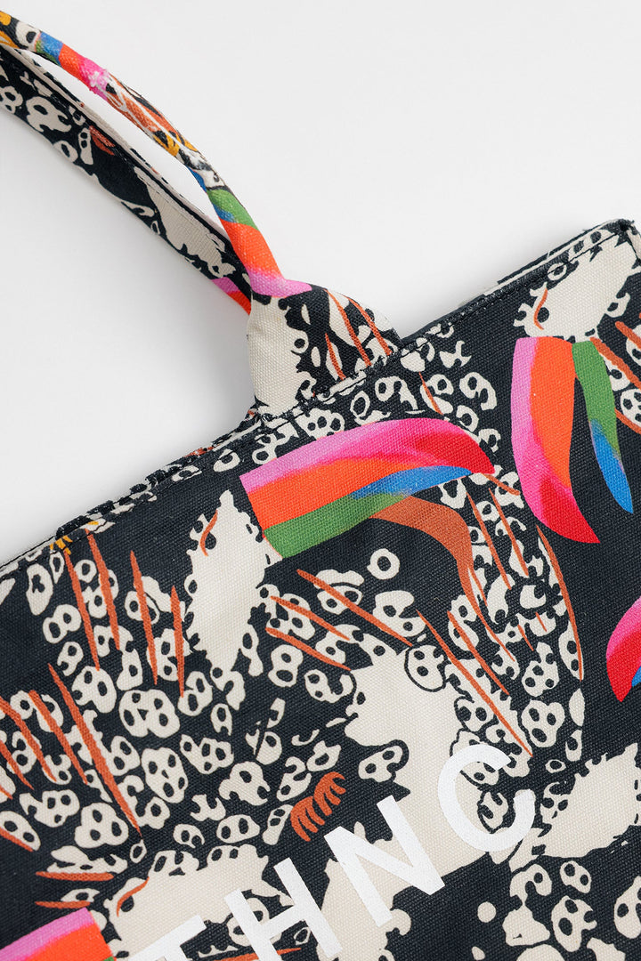 Illustrating the artistically rich canvas bag rendered in a deep black shade and is detailed with abstract designs printed in vibrant hues. The trendy bag is a great addition to your accessories' collection.