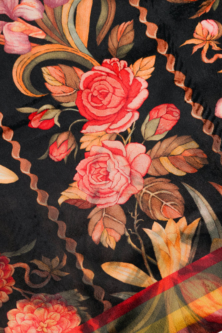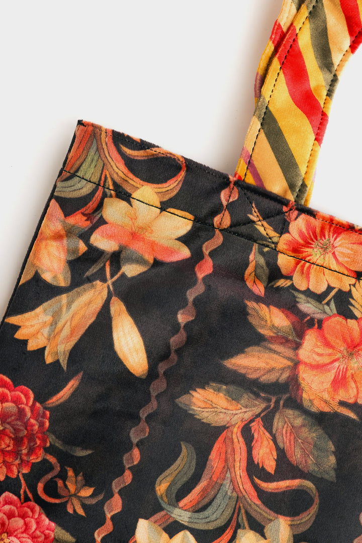 This is a floral-patterned tote bag with vibrant multi-colored flowers and leaves on a black background. The bag features multi-color striped handles, adding a contrasting yet cohesive touch to its design. It has a simple, rectangular shape, perfect for casual use or shopping.