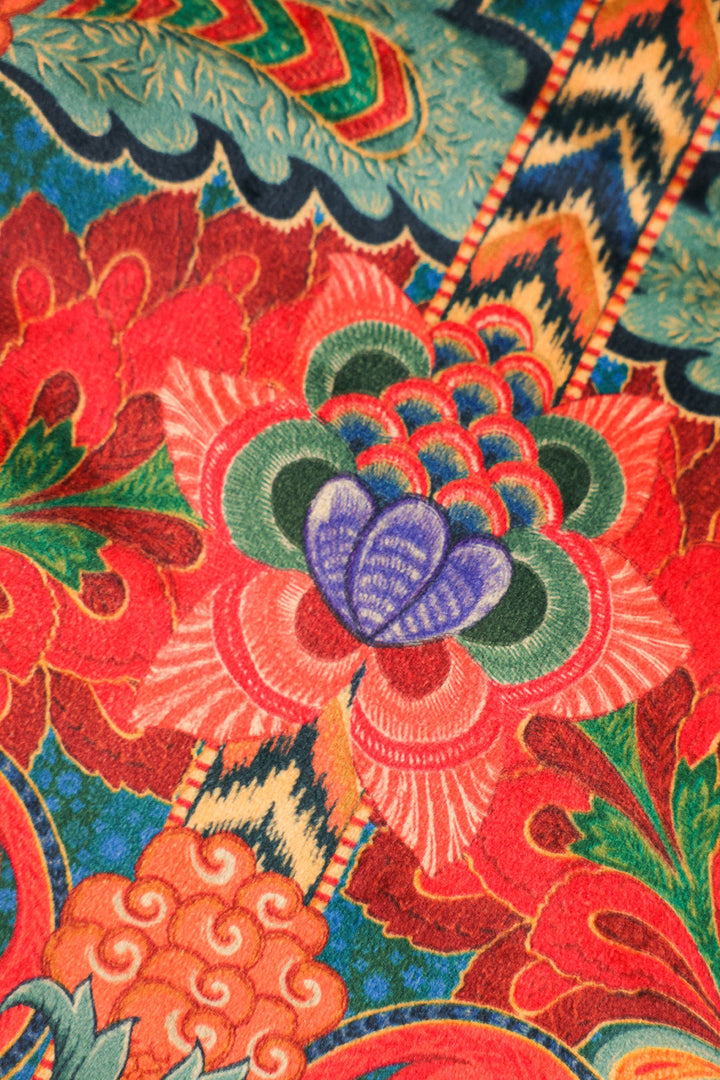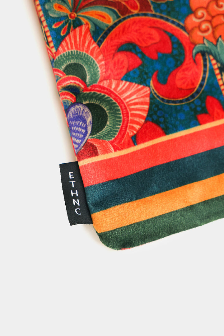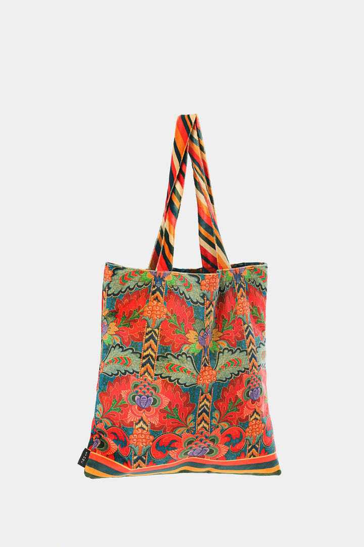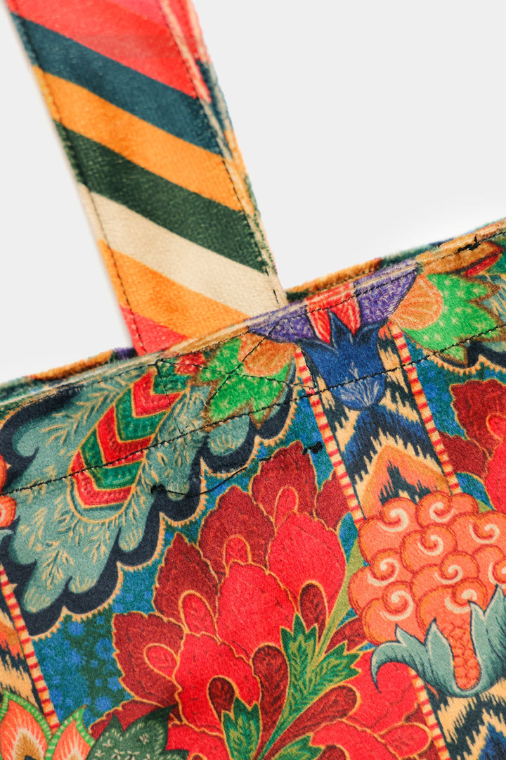 A colorful tote bag with a bold, intricate design featuring symmetrical patterns in red, green, blue, and yellow tones with floral and geometric elements. The bag has striped handles with alternating red, black, and yellow colors, complementing the vibrant design. It is rectangular and suitable for carrying essentials or shopping.