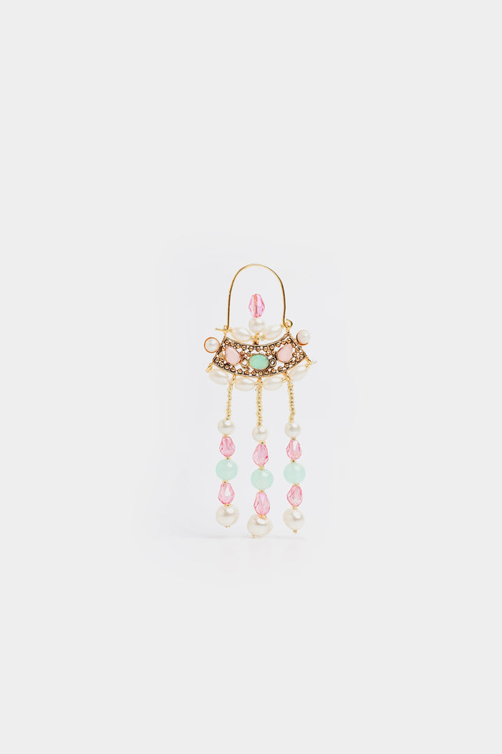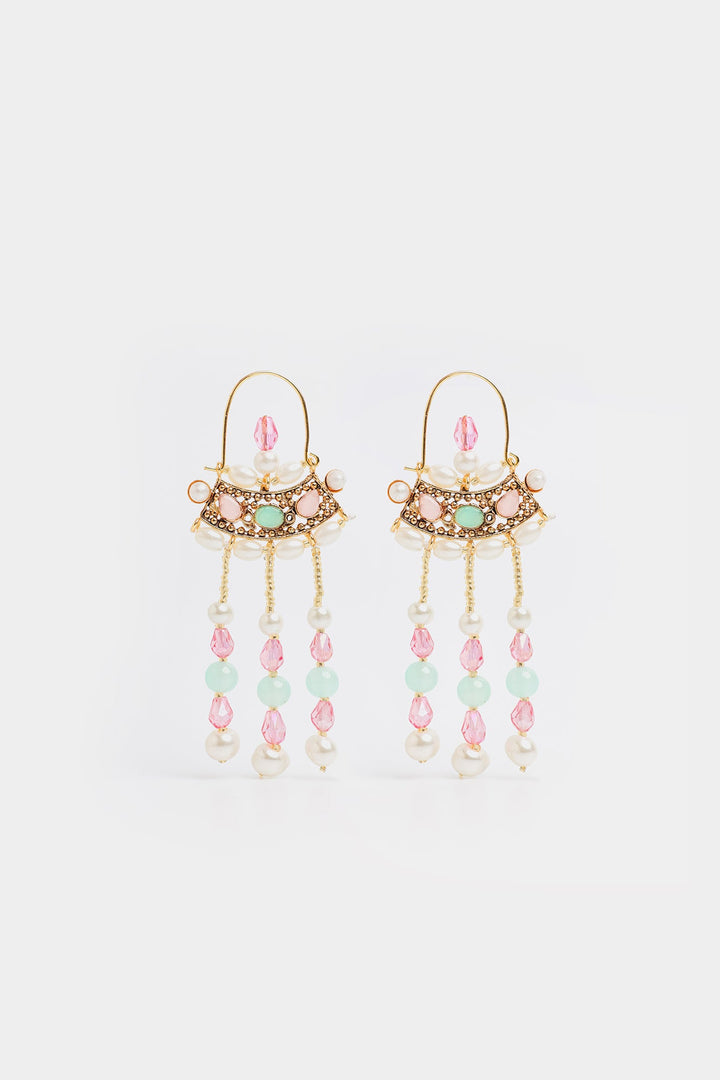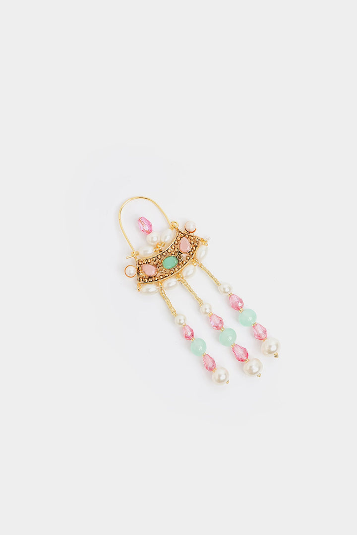 These earrings are designed and adorned with three dangling chains, each ending with small mint and white beads. Their elegant design will elevate your appearance, making you stand out from the crowd. Perfect for any occasion.