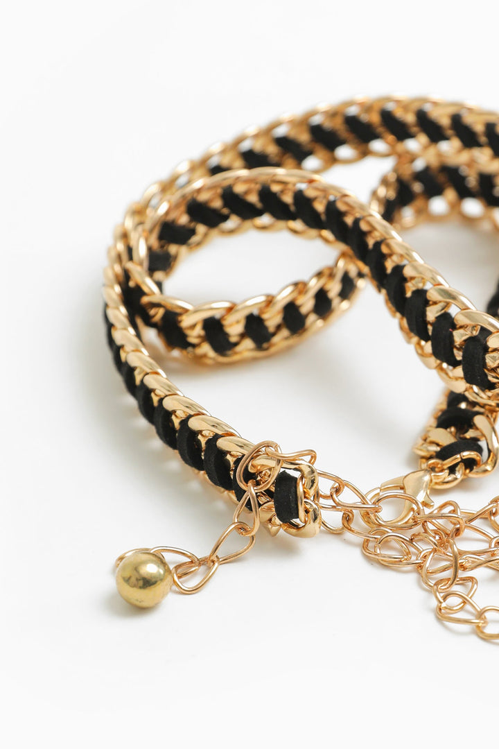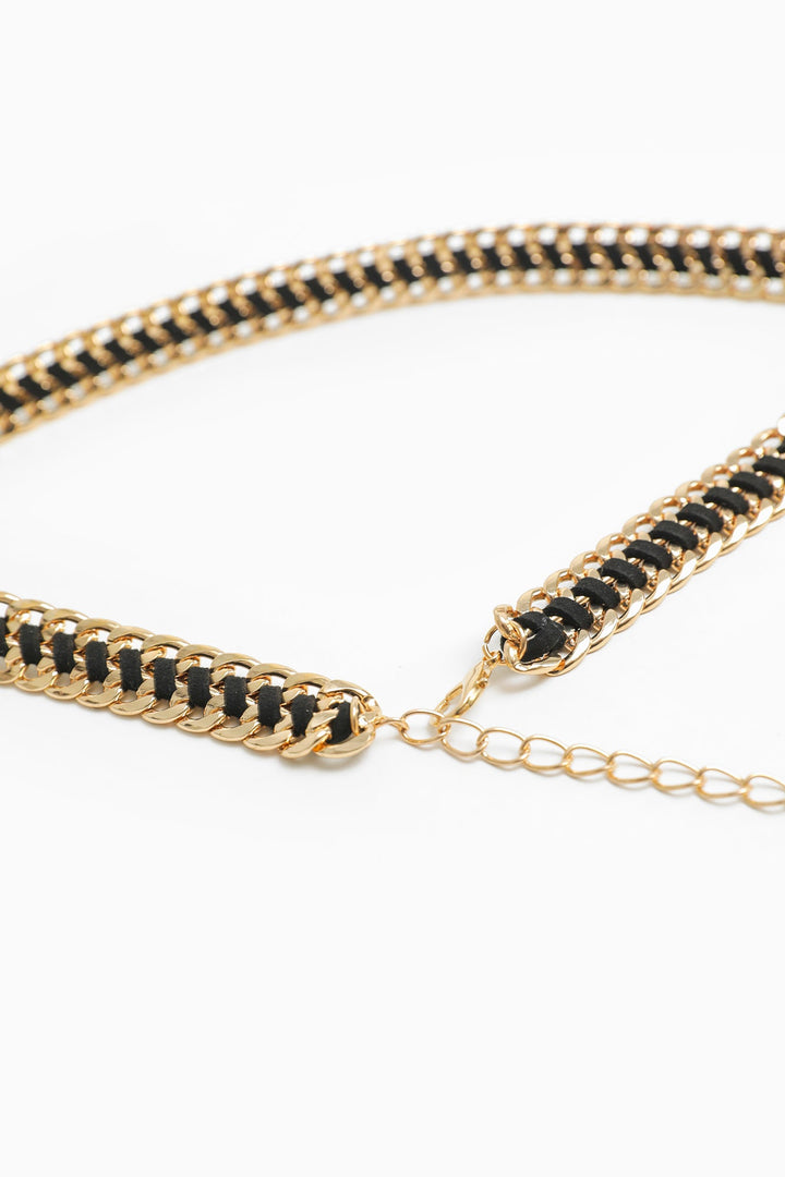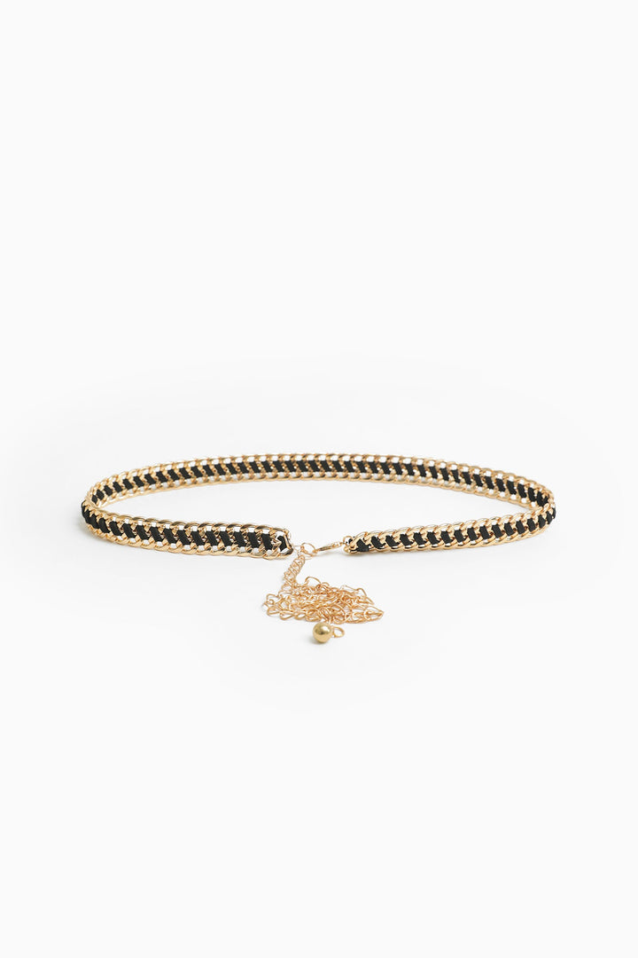 A classy chain link belt featuring black straps interlinked with chain-link in gold accents with bead detailing and adjustable fit. Style this trendy belt with chic outfits and embrace the fashionable look.