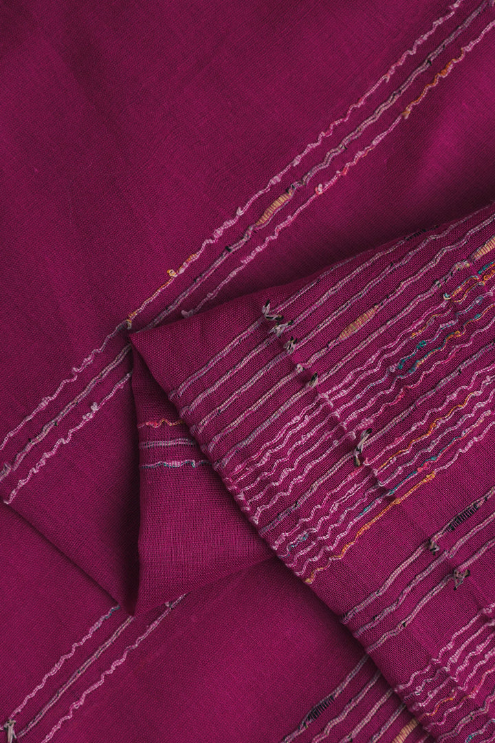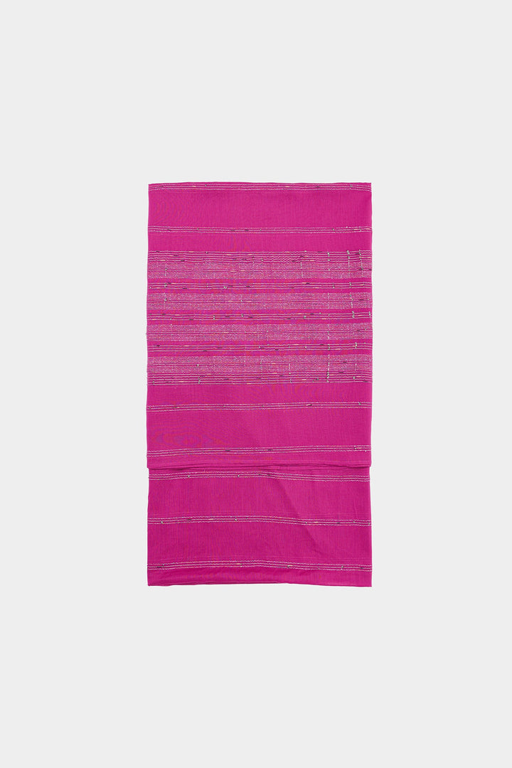 The vibrant pink fabric with a woven texture. The fabric features a pattern of irregularly spaced, colorful horizontal and vertical threads in shades of pink, purple, and white. The threads create a striped effect, adding a dynamic and handcrafted aesthetic to the textile. The material has a rich texture, indicative of handwoven or artisanal fabric.