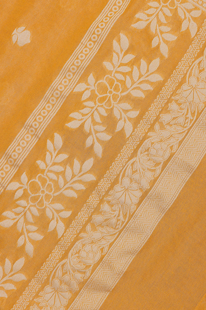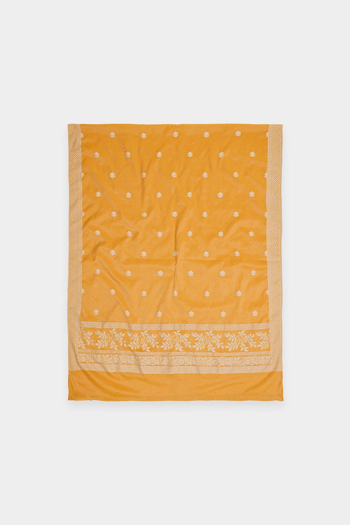 Grace any outfit with this elegant golden brown dupatta, featuring a sophisticated white pattern. The soft, neutral base is adorned with delicate white motifs scattered across the fabric, creating a subtle texture. The borders are exquisitely designed with a contrasting pattern – one side featuring a repeating chevron pattern, and the opposite end showcasing a beautiful floral vine design. This versatile dupatta is perfect for adding a touch of classic charm and refinement to your shalwar kameez or kurta set.
