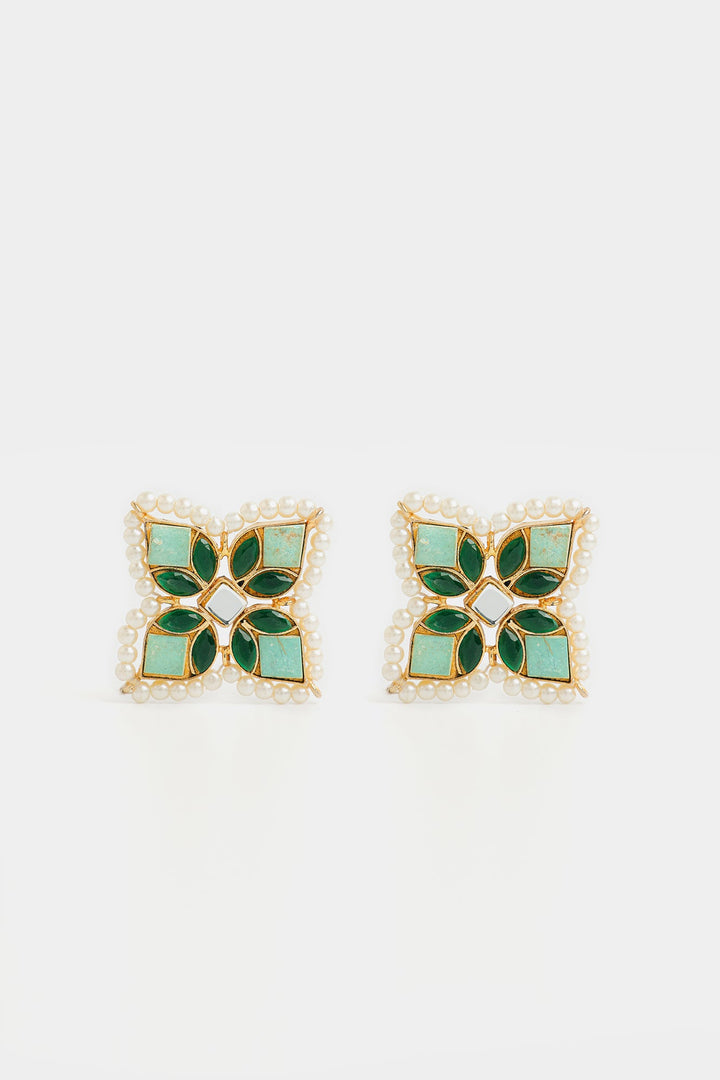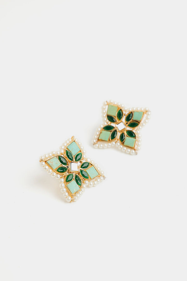 A pair of decorative earrings in a floral design. Each earring features a symmetrical, four-petal shape with intricate detailing: Green tones dominate the petals, paired with gold accents. The outer edges are outlined with tiny pearl-like embellishments. The earrings have a traditional aesthetic that could complement ethnic or festive attire.
