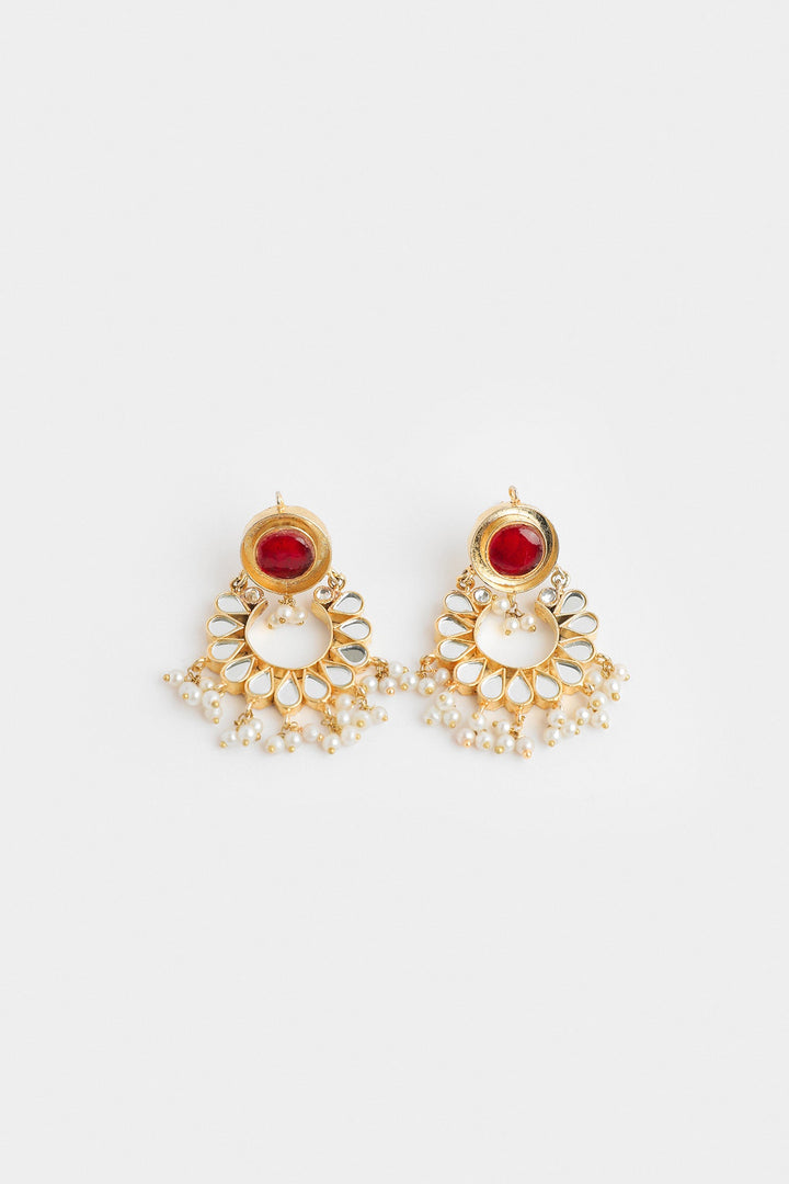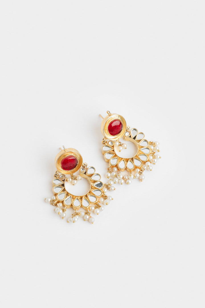 Style statement designs are portrayed on these exquisite earrings crafted with geometric round silhouettes in gold shade and embellished with studded mirrors and trendy stone in burgundy color. Style these classy earrings and embrace the gorgeous look this season.