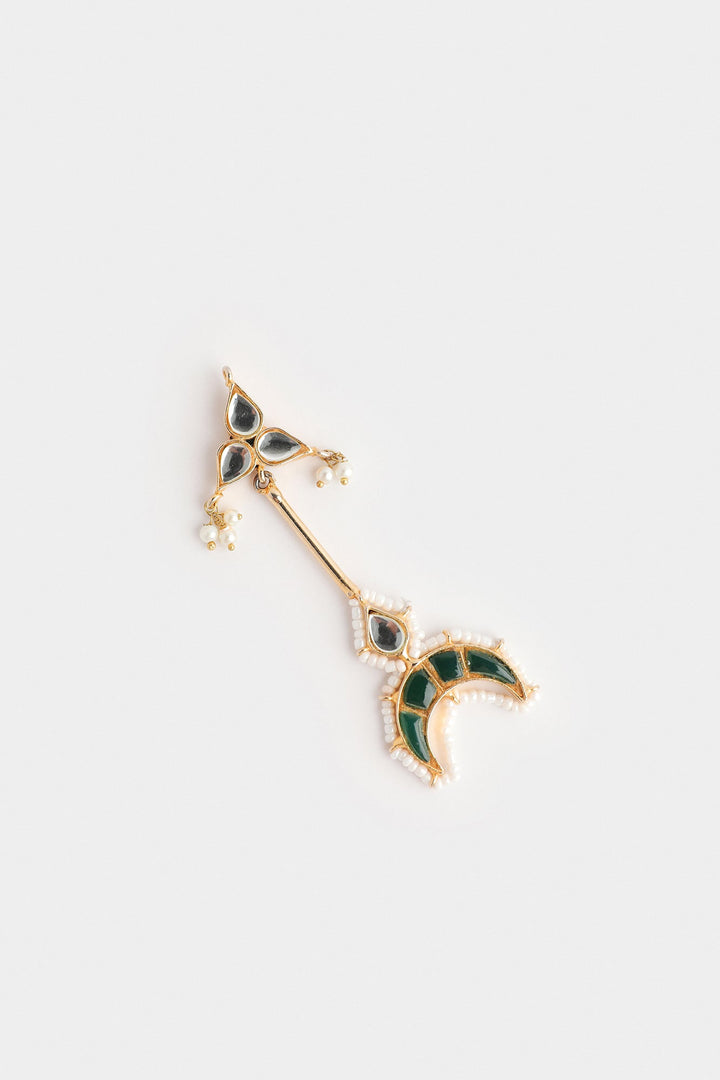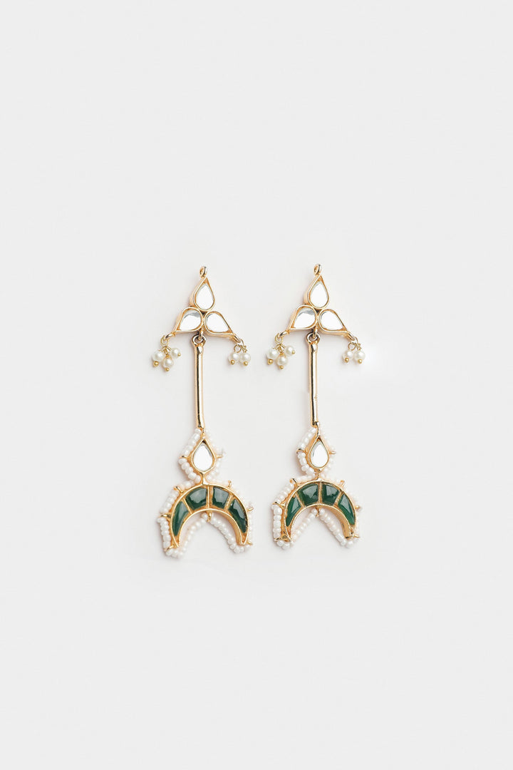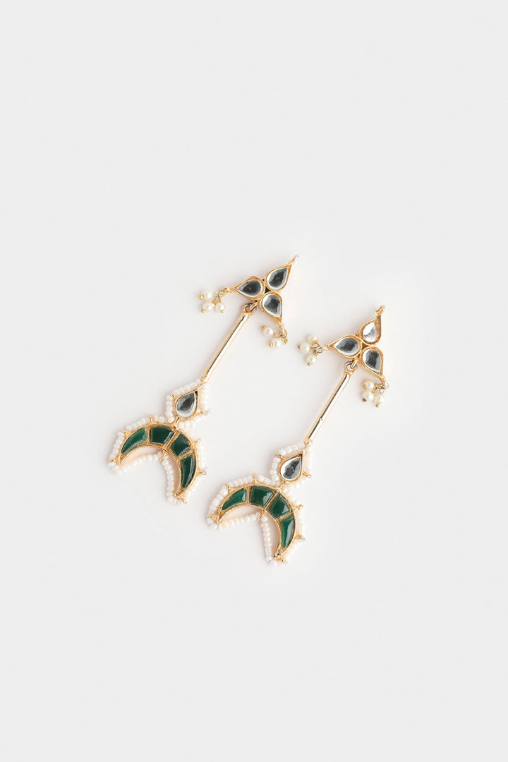Style statement designs are portrayed on these exquisite earrings crafted with contemporary floral and half moon silhouettes in gold accents and embellished with dazzling stones in and emerald green shade. Style these classy earrings and embrace the gorgeous look this season.