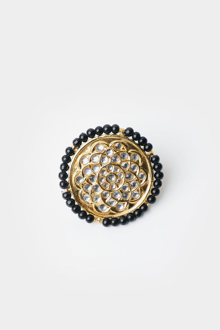 The central part of the piece is a golden disc adorned with a cluster of small, sparkling beads arranged in a circular pattern with a border of black beads, adding a contrasting touch to the overall design. The piece combines elegance with color contrast, making it suitable for both formal and traditional attire.