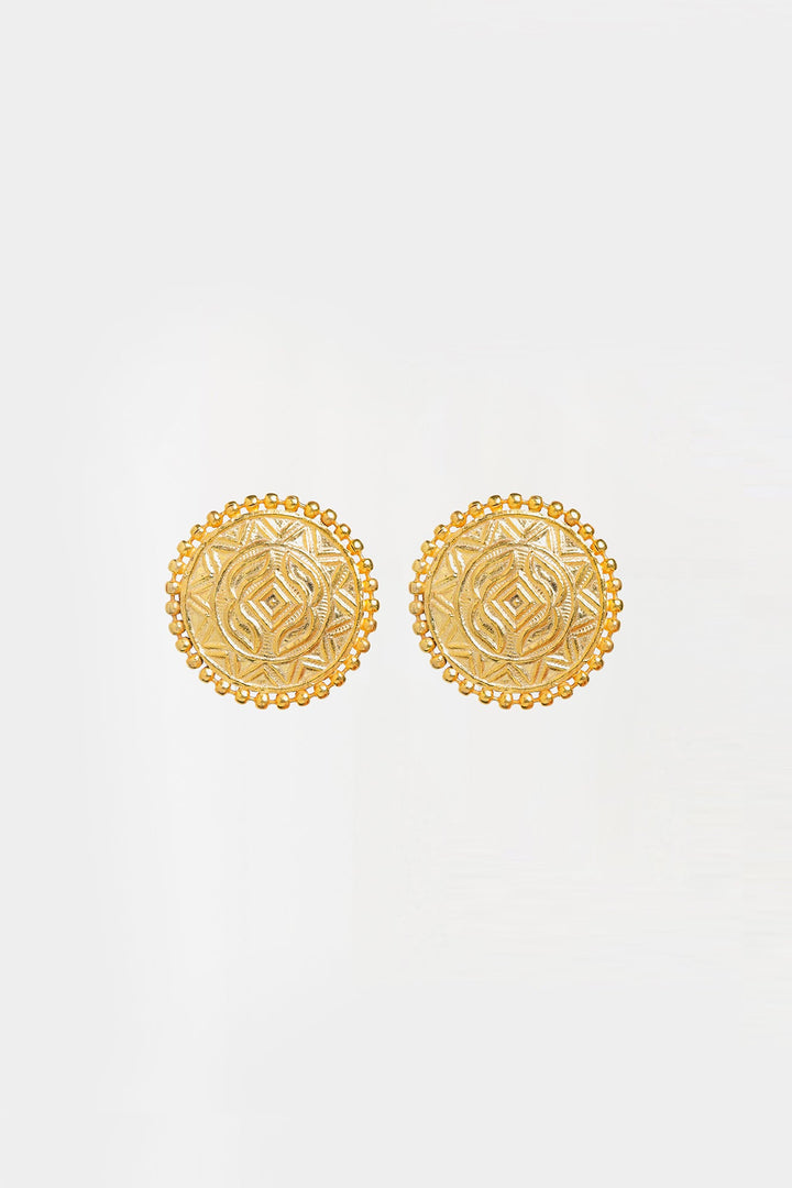 A gracefully chic design is layered over these elegant earrings portraying round geometric shape in gold shade and embellished with scintillating embossed design and enhanced with small golden rounds at outer side. Style these delicate studs for sophisticated looks this festive season.