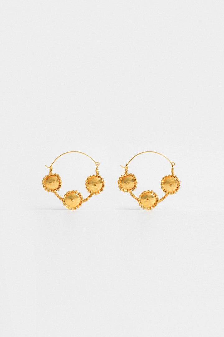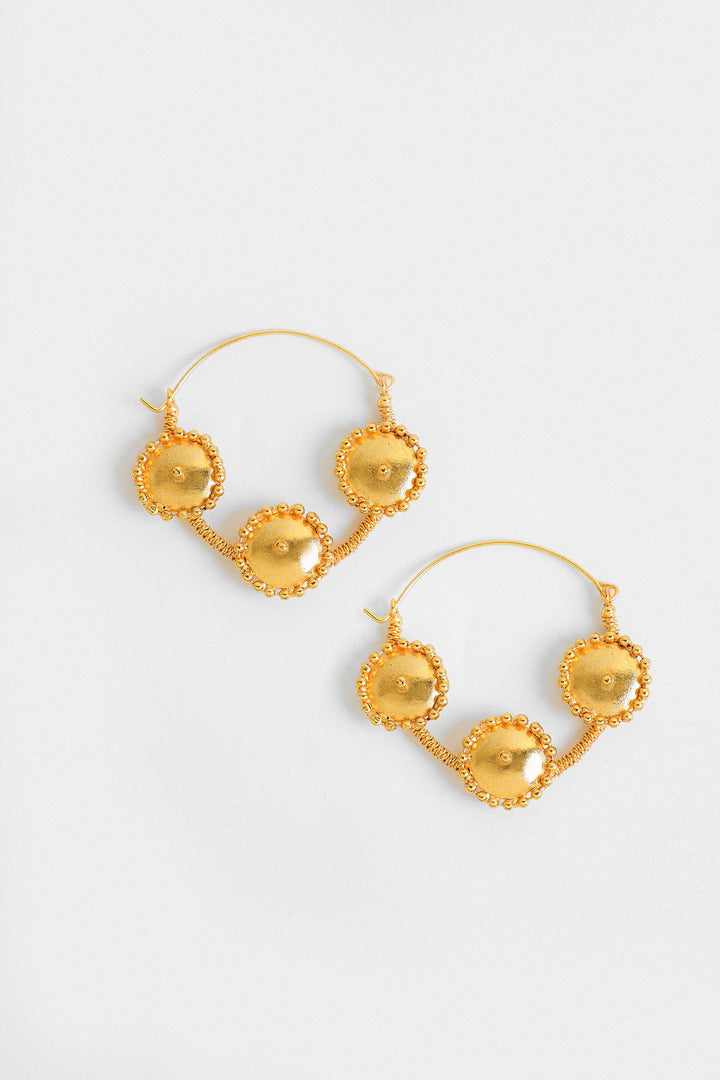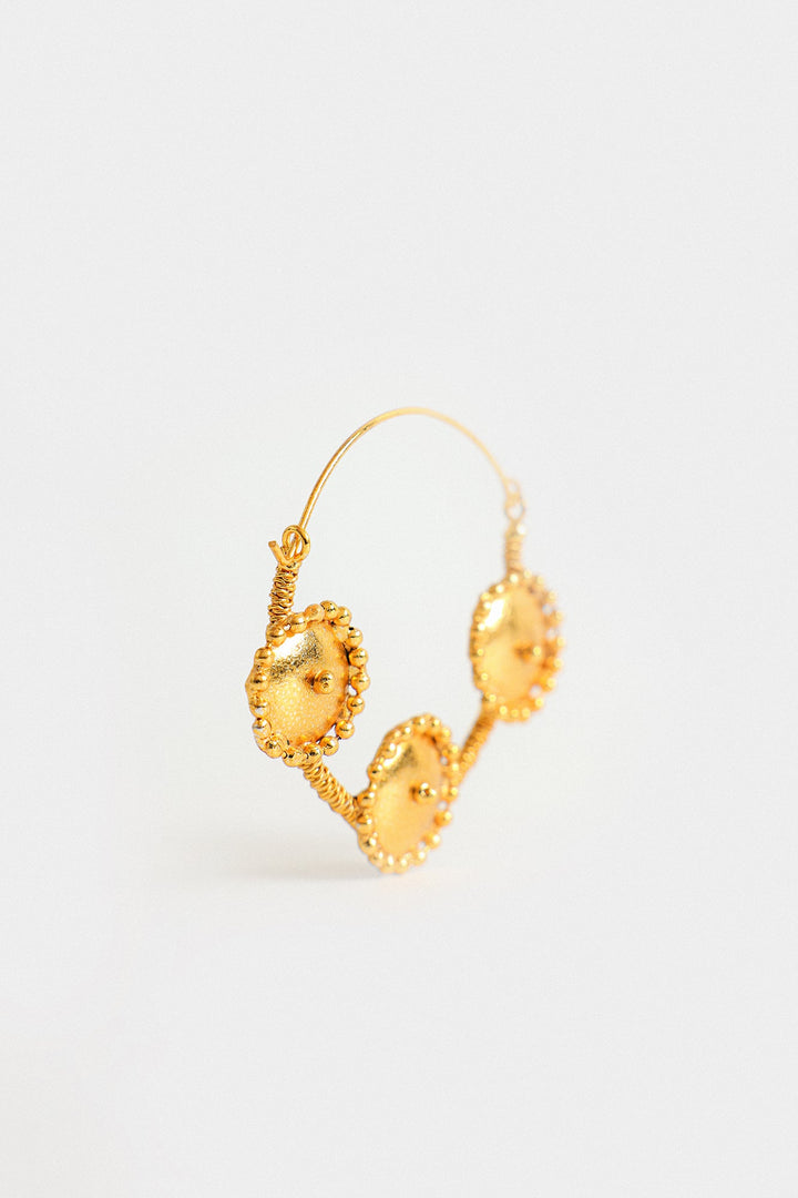 The elegant gold hoops have a unique design. Each hoop features three prominent circular discs that are evenly spaced along the lower half of the hoop with an intricate appearance. The overall design blends simplicity with a touch of ornamentation, making these earrings suitable for casual and formal wear.
