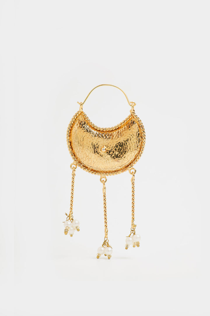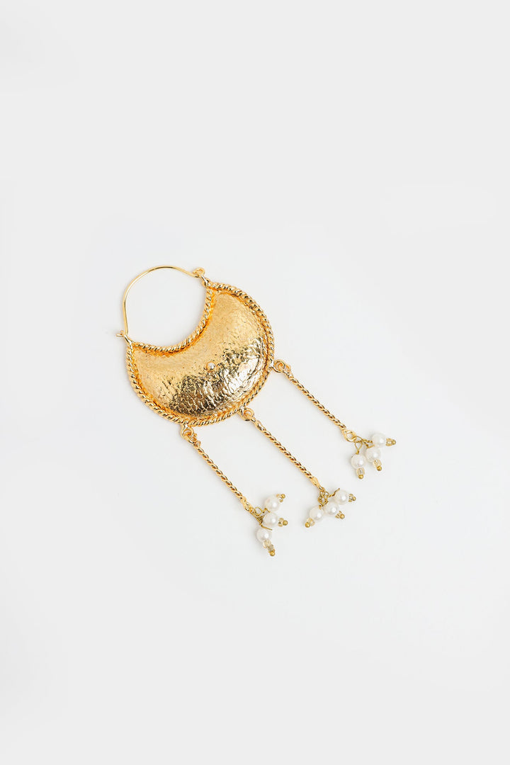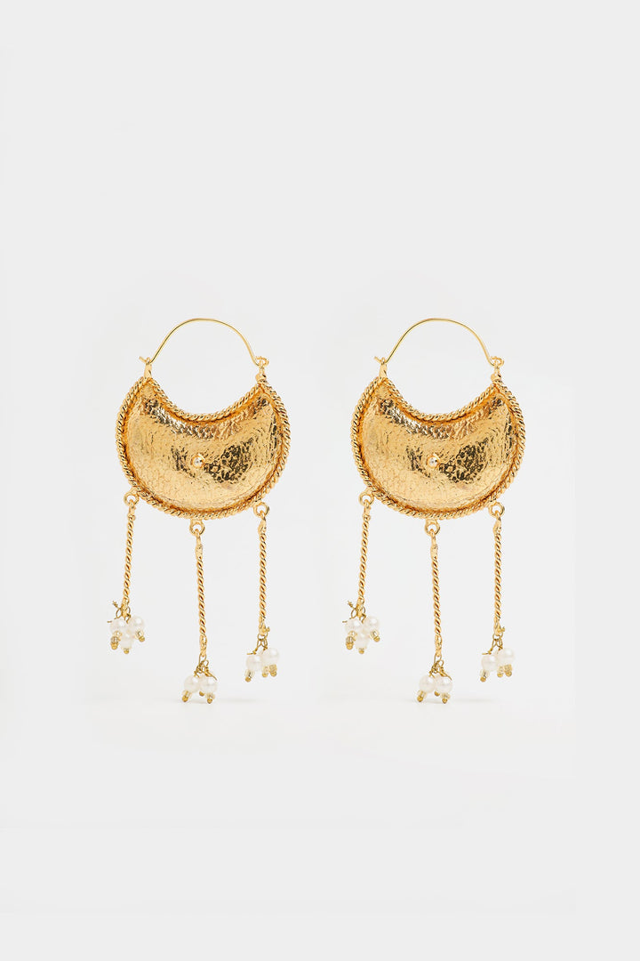 These earrings are designed with a crescent moon shape, featuring a hammered gold texture. They are adorned with three dangling chains, each ending with a small white bead.