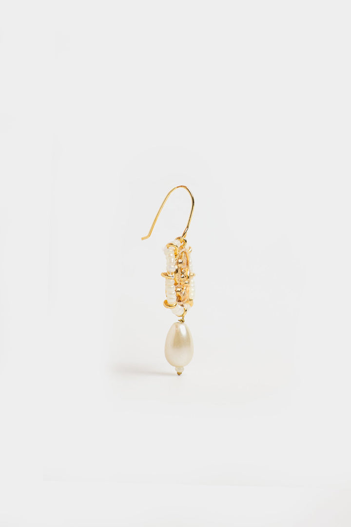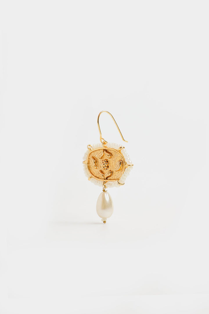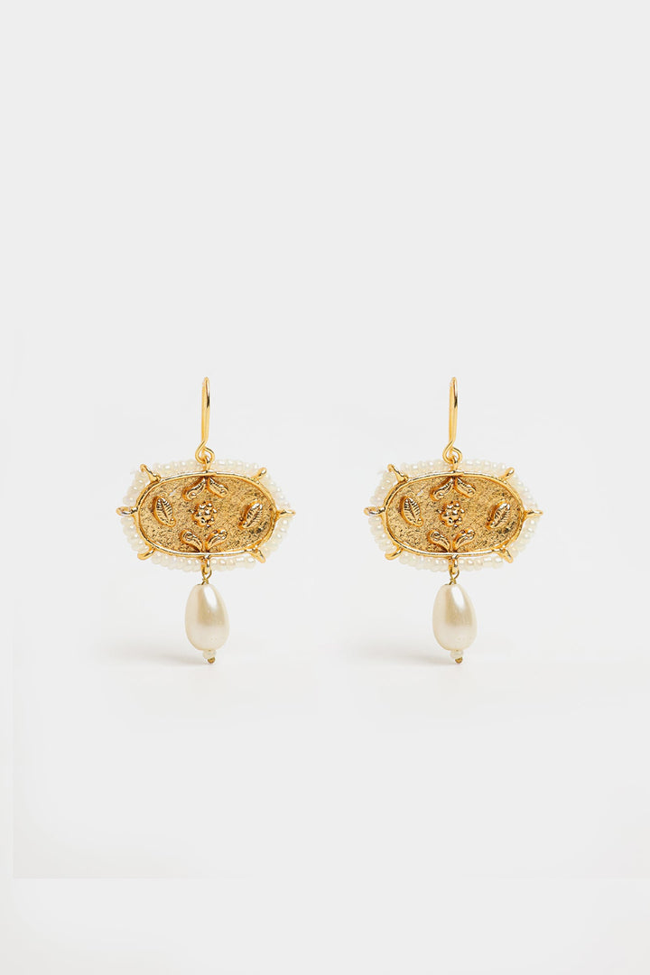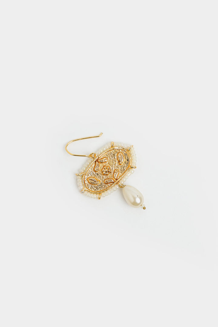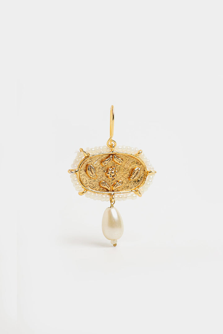 This eye-catching earring features an oval-shaped gold design with intricate detailing. Surrounding the gold centerpiece are small white beads that form a delicate border. Below the oval design, a single teardrop-shaped white bead dangles, adding a touch of elegance. The earring is suitable for adding a refined accent to formal attire.