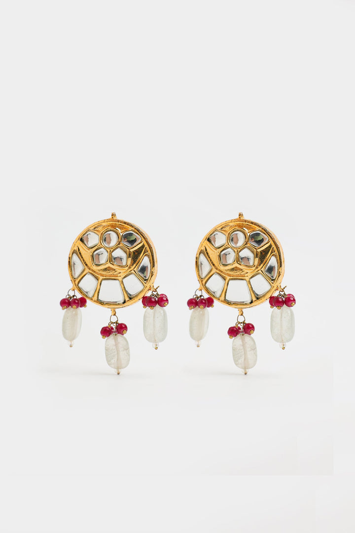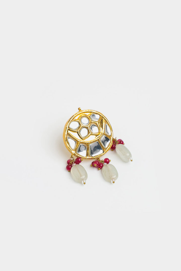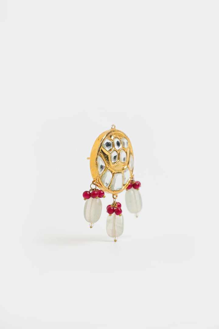 A white Kundan stud with pearl drops that dangle gracefully, adding movement and a touch of classic elegance to the piece. This combination of Kundan and pearls creates a timeless and regal aesthetic, perfect for special occasions and traditional attire.
