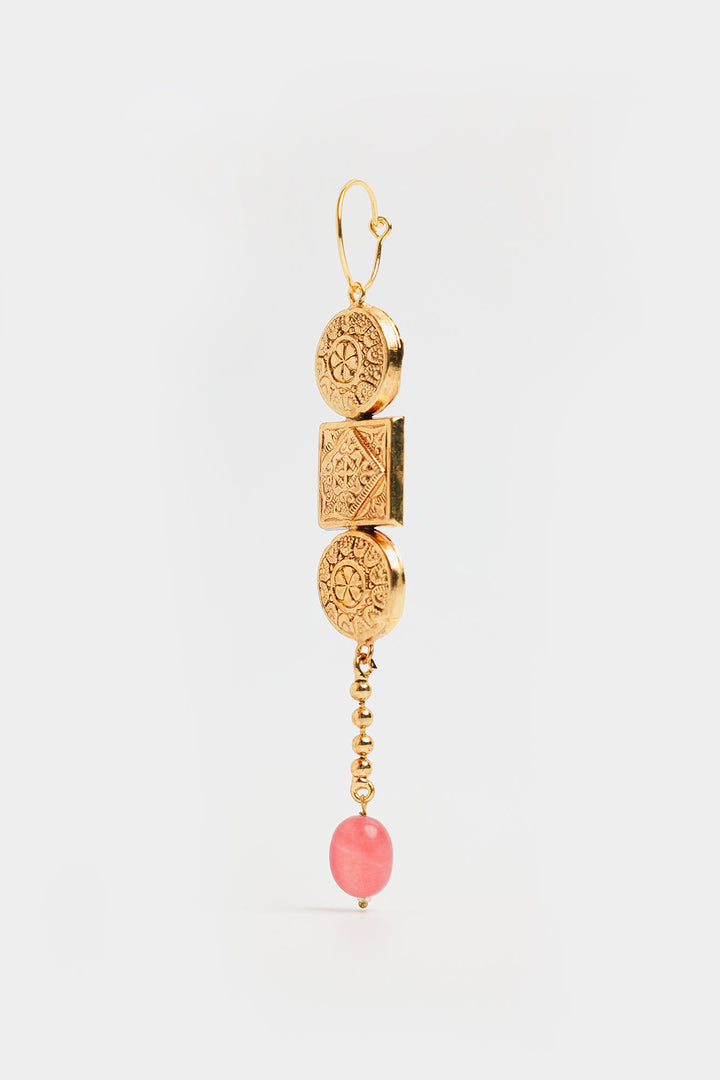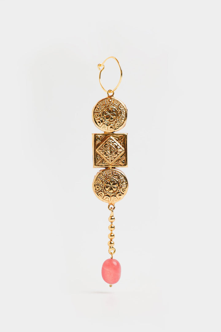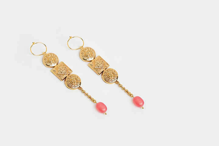 The design features two intricately detailed gold-plated discs, sandwiching a square motif with delicate patterns. The elegant drop is completed with a string of small gold beads leading to a charming pink bead at the bottom, adding a pop of color and a touch of femininity. Perfect for elevating any outfit.